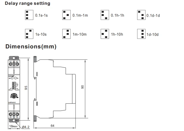 Le relais est conçu pour un montage sur rail DIN, ce qui le rend facile à installer dans différents types d’environnements. Il offre également une échelle de temps divisée en 8 plages, ce qui permet un réglage précis en fonction de vos besoins spécifiques. Les plages de temps disponibles sont les suivantes: 0.1-1s, 1-10s, 0.1-1min, 1min-10m, 0.1h-1h, 1h-10h, 0.1d-1d, 1d-10day.