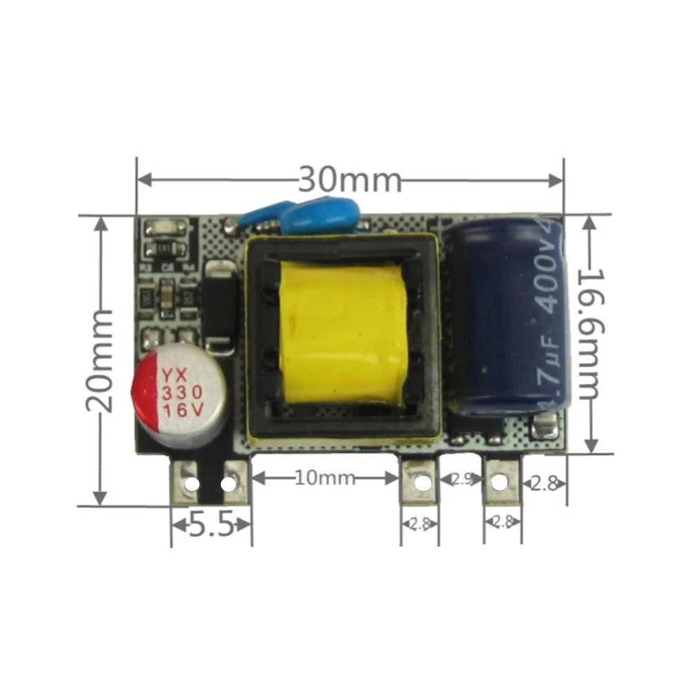 Ce module d’alimentation à découpage est conçu pour fournir une tension de sortie de 3.7V / 4.2V 2000mA / 5V 1700mA / 9V 800mA. Il est doté d’une faible ondulation AC-DC et d’une isolation d’entrée. Le module peut accepter une entrée AC de 85-280V et une entrée DC de 100-380V. Il offre une efficacité de 73% à 78% et une veille à vide de 30mW pour une tension de 5V et de 75mW pour une tension de 12V. La plage de fréquence de ce module est de 50-70 KHz.