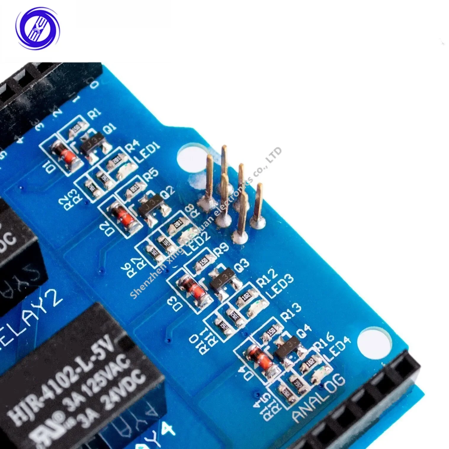 Le bouclier de relais dispose d’une interface de relais sky-relais 5V DC, modèle HJR-4102-L-5V. Il est alimenté en 5V DC et possède 4 voyants rouges pour indiquer l’état des relais. Les bornes relais permettent de connecter des appareils haute puissance et haute tension.