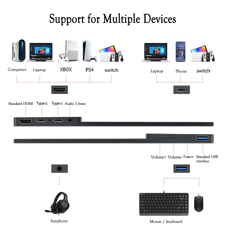 Cet écran portable est compatible avec les PC portables, les téléphones, les Xbox, les Switch et d’autres appareils dotés d’une interface HDMI, USB-A ou USB-C.