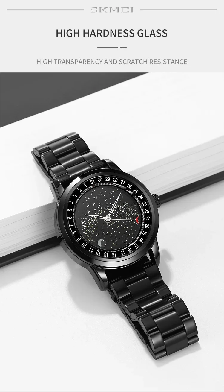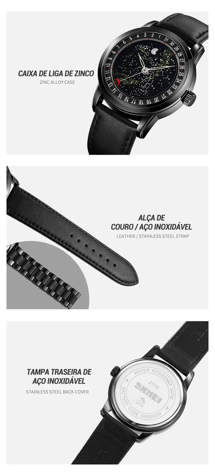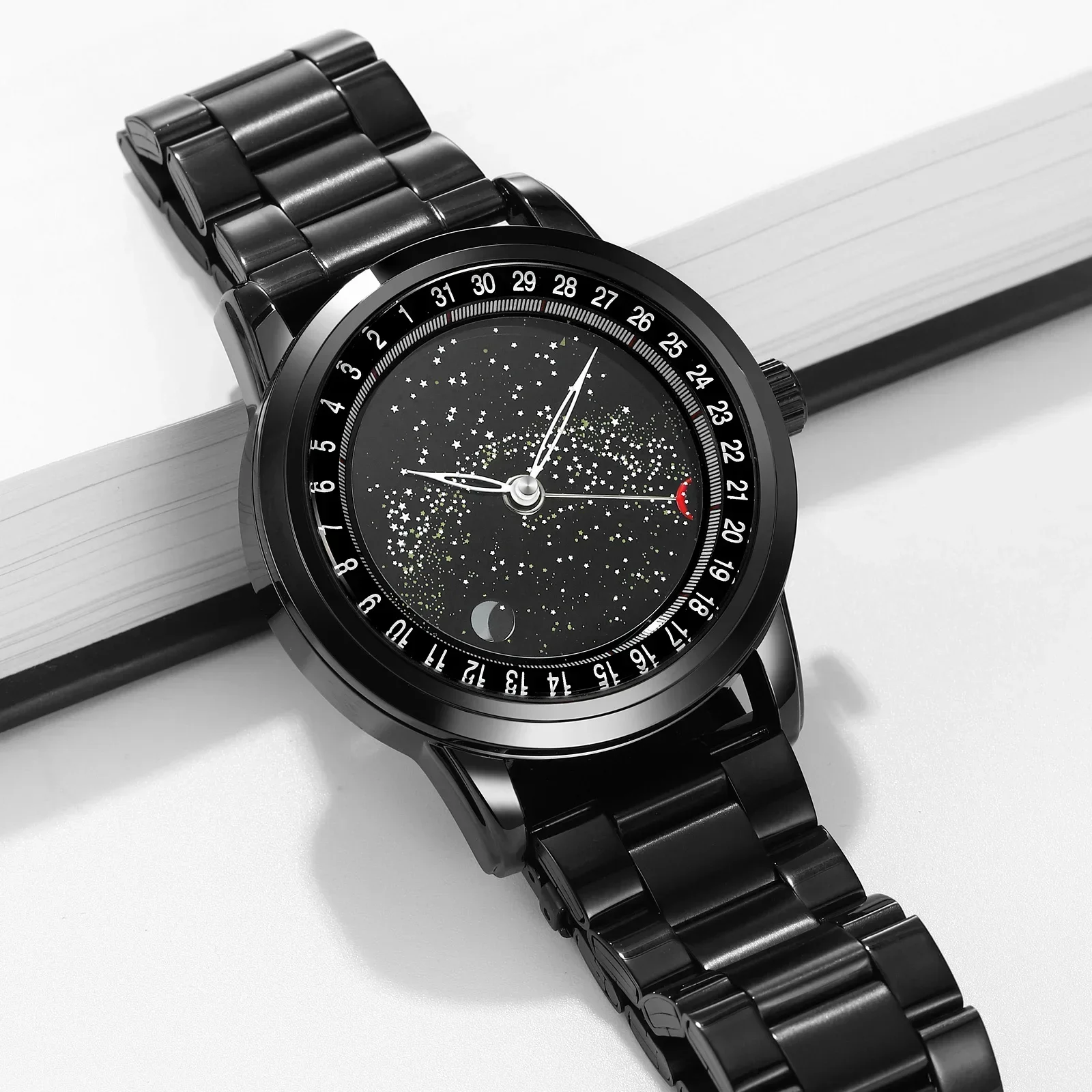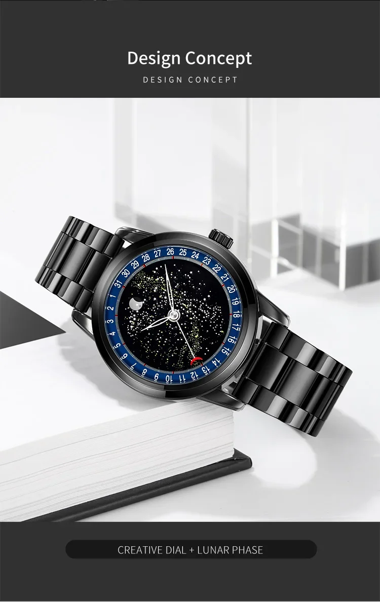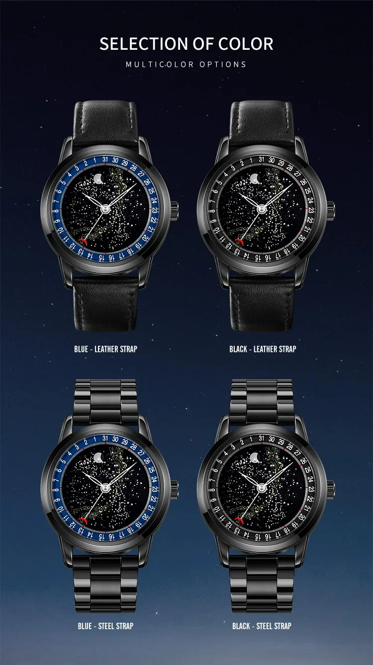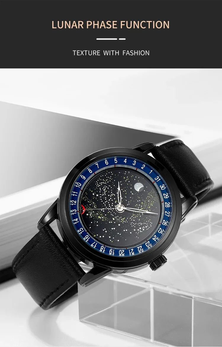 précision de temps, tandis que le design du ciel étoilé et de la phase de lune ajoute une touche de