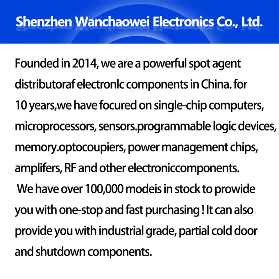 Wan chao wei a été créé en 2014, nous sommes un distributeur de composants électroniques avec un grand nombre de canaux d’alimentation à long terme et stables. Fournir des circuits intégrés coprofessionalmmon ou rares pour les clients du monde entier. Notre équipe professionnelle déploie un grand nombre de stocks au comptant nationaux via l’énorme base de données système client de l’entreprise chaque jour, Fournissez soigneusement la citation du modèle de produit pour chaque client.