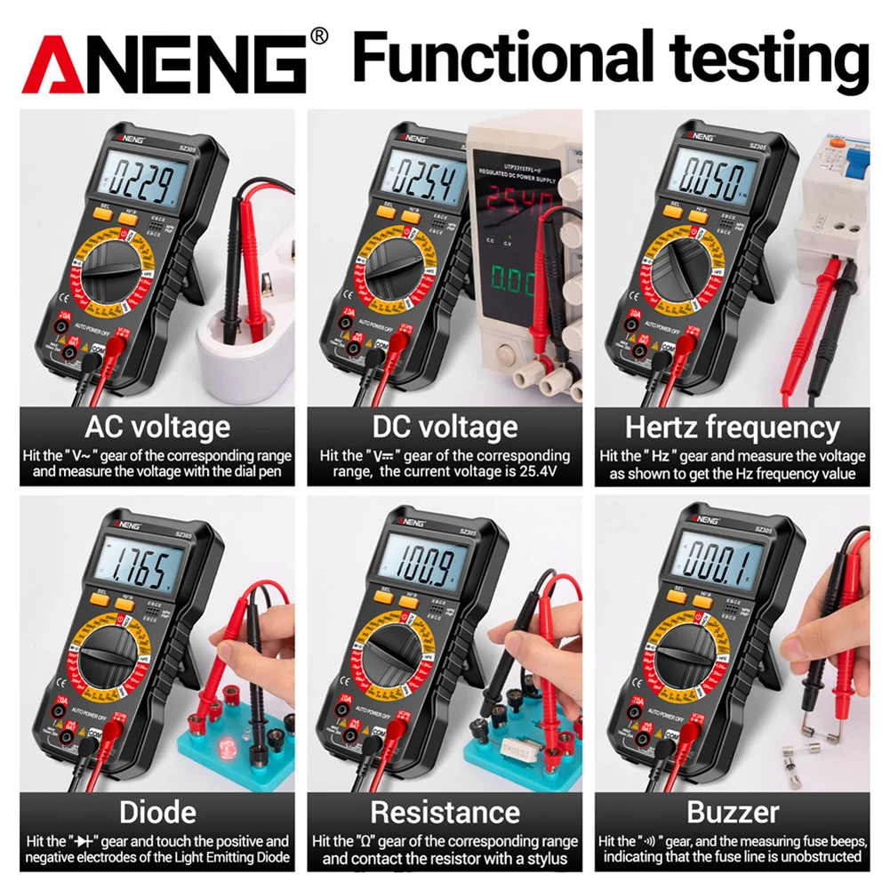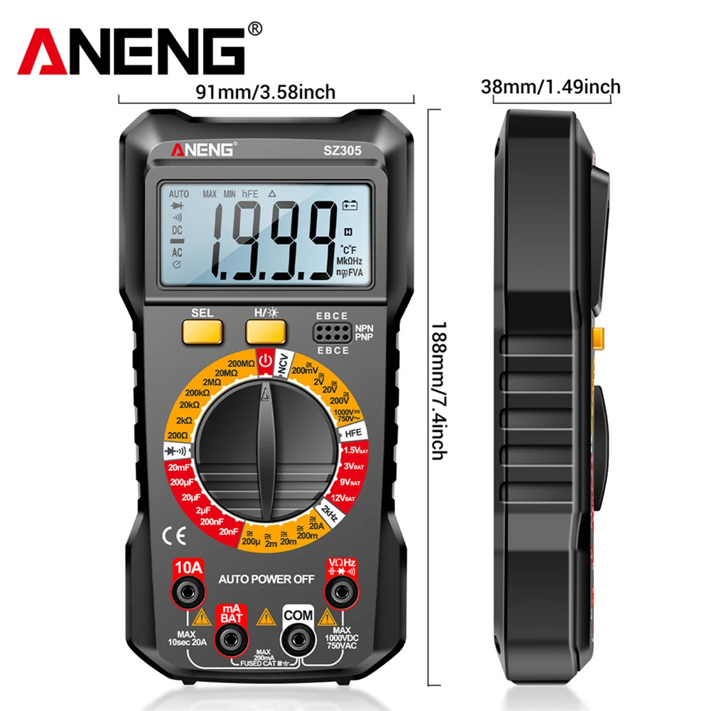 Ce détecteur de tension à plage automatique offre de nombreuses fonctionnalités de mesure, telles que la tension AC/DC, le courant AC/DC, la résistance, la capacité, le test de diode et le transistor hFE. Il convient aussi bien aux professionnels qu’aux amateurs de bricolage.