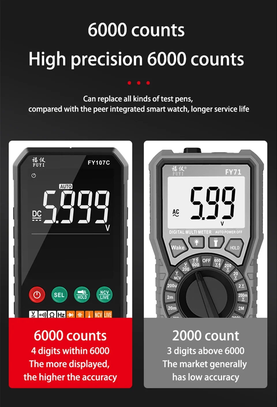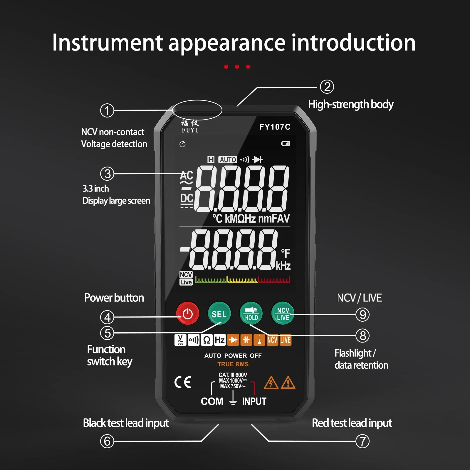 Le FY107C/FY107B Multimètre numérique est un outil polyvalent doté de nombreuses fonctionnalités. Il est capable de mesurer la tension alternative, la tension continue, la résistance, la fréquence, la capacité, la température et plus encore. Il dispose également d’une fonction de détection de fil sous tension, de rétroéclairage et d’une lampe de poche intégrée.