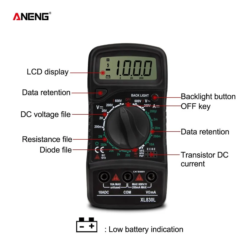 Ce multimètre numérique multifonctionnel de haute précision, le ANENG XL830L, est un outil idéal pour les électriciens. Il possède un écran LCD clair et facile à lire, ainsi qu’une protection contre les surcharges et les feux arrière bleus sur toutes les gammes.