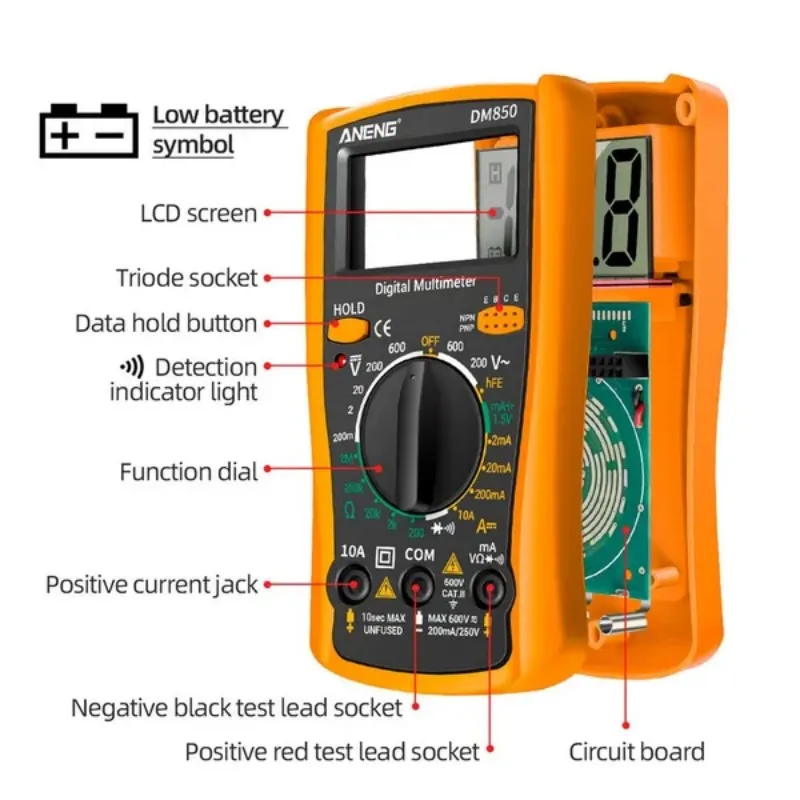 Les principales fonctionnalités de ce multimètre sont la mesure de la tension AC / DC, la gamme de fréquence, le test de continuité sonore, la mesure du courant continu, de la résistance et de la diode, et la capacité de fournir une protection contre les surcharges et une indication de batterie faible.