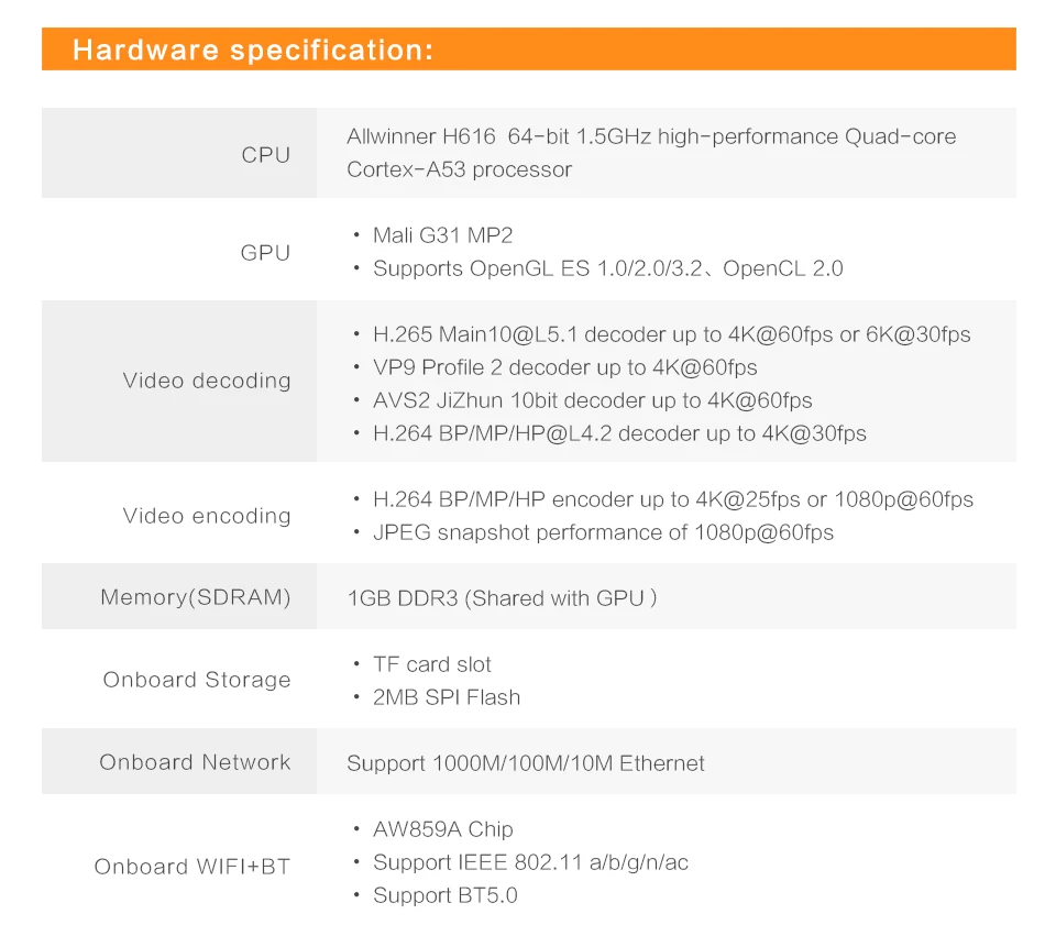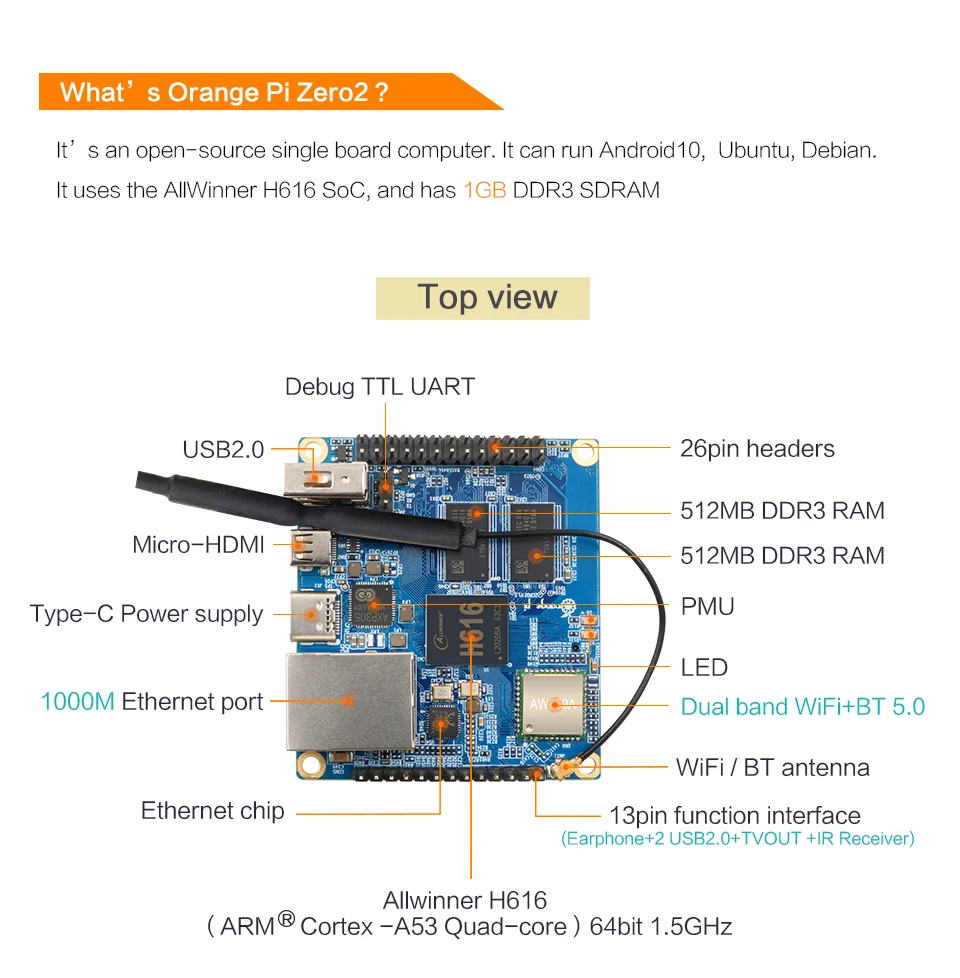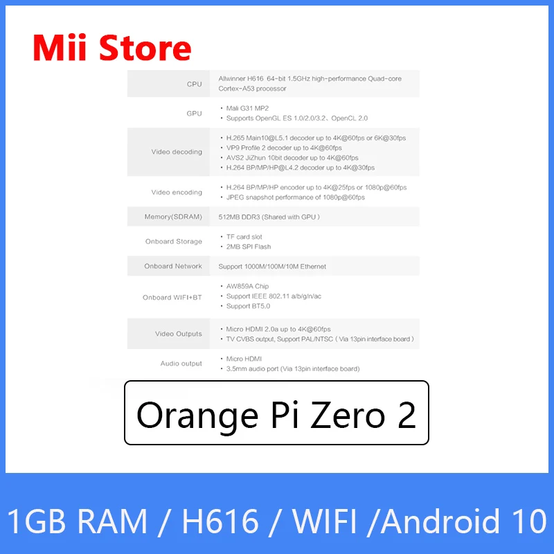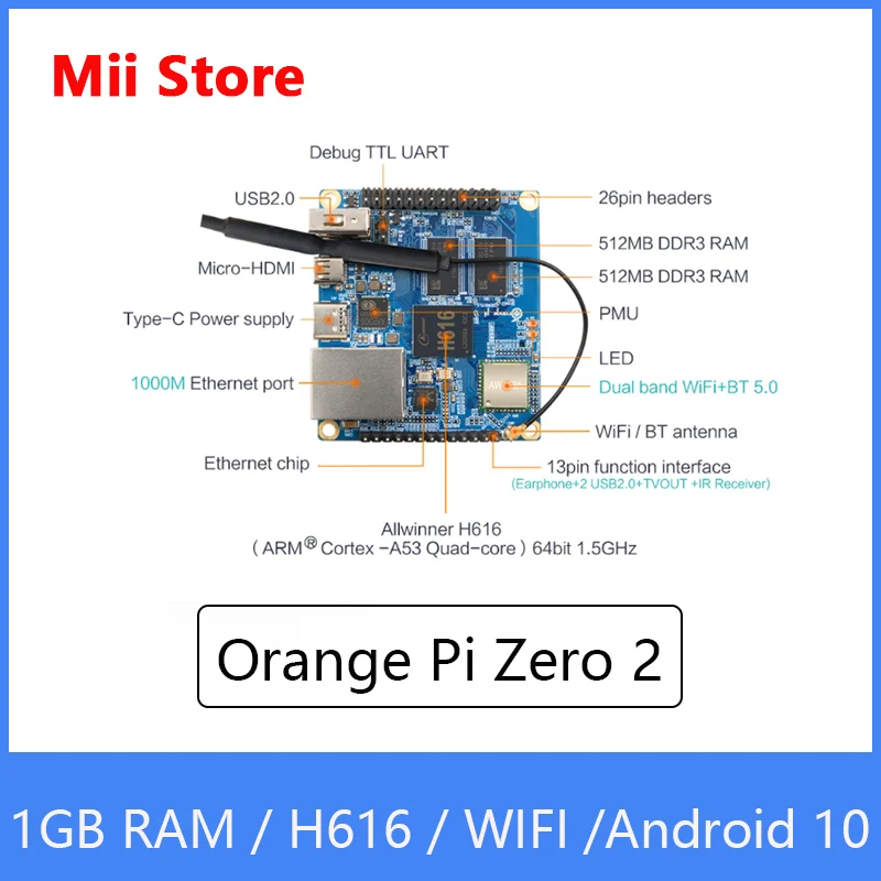 Avantages : La carte Orange Pi Ontari2 offre une compatibilité étendue avec Android 10, Ubuntu et Debian. Elle est dotée d’une puce Allwinner H616 et d’une mémoire vive de 1 Go. De plus, elle est compatible avec le Bluetooth et le Wifi.