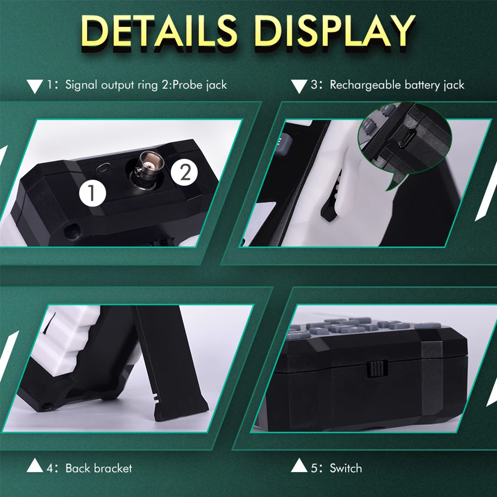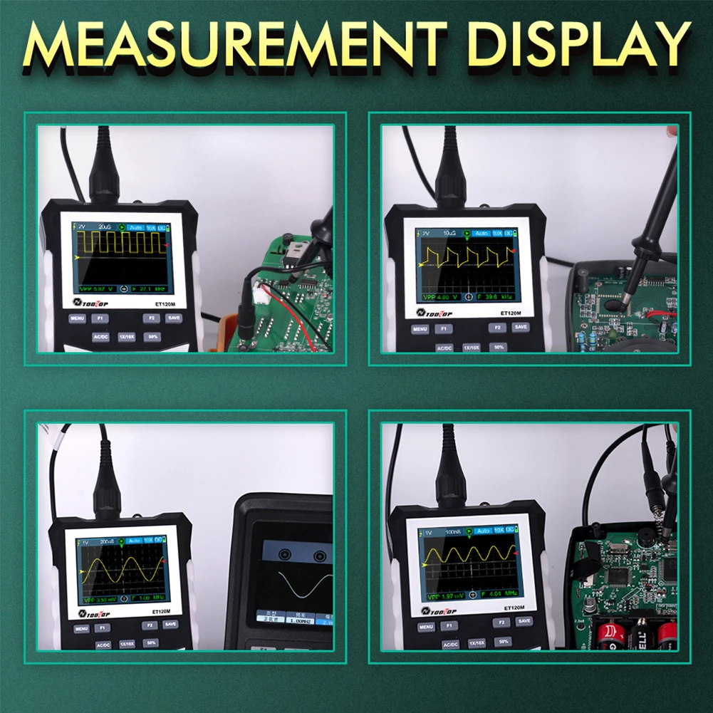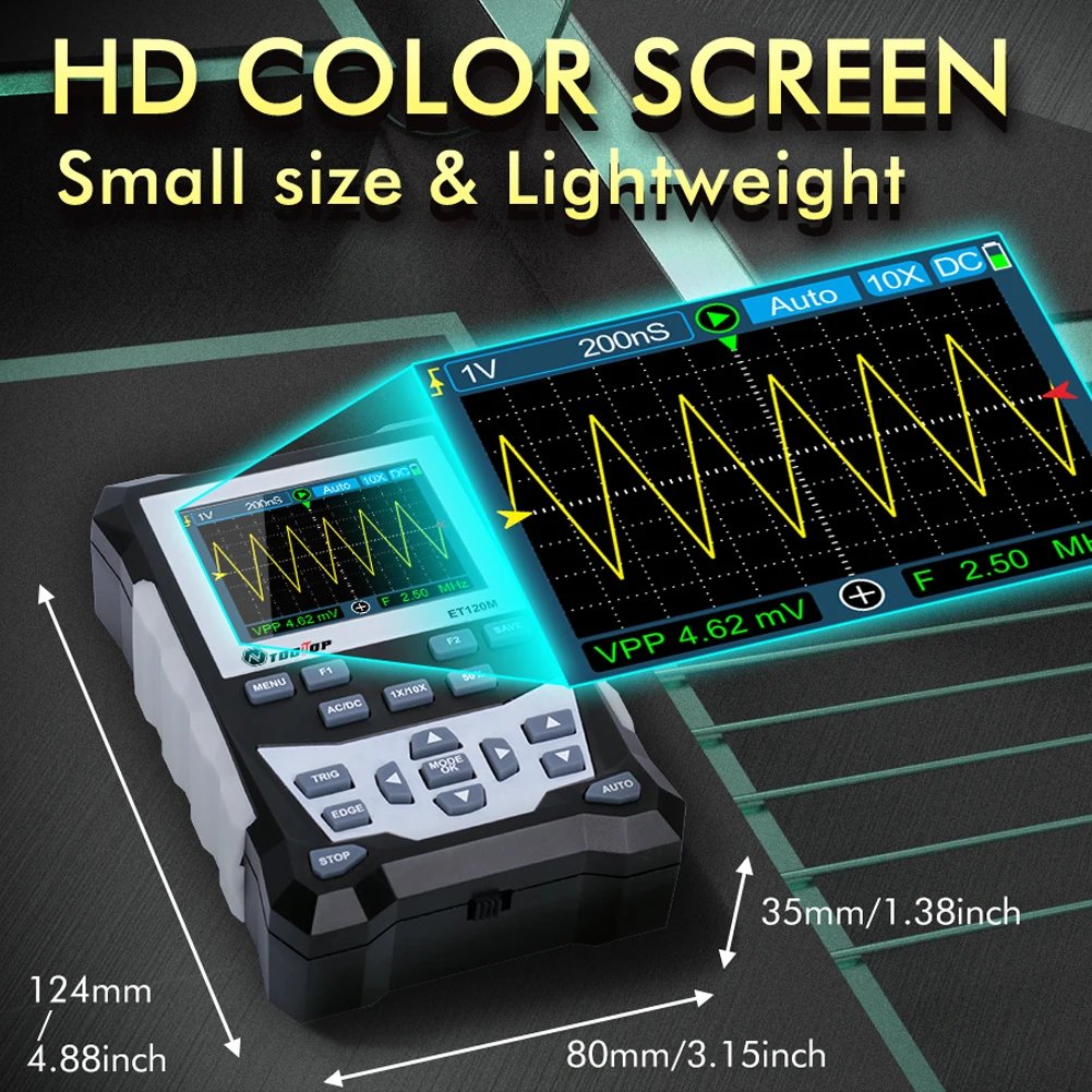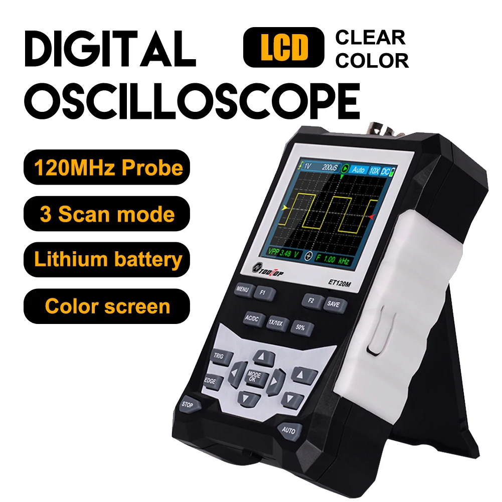 L’oscilloscope numérique avec écran de 2.4 pouces est un appareil polyvalent qui combine les fonctionnalités d’un oscilloscope, d’un multimètre et d’un générateur de signal. Il offre une bande passante analogique de 120MHz et un taux d’échantillonnage de 500MS/s, permettant une analyse précise des signaux.