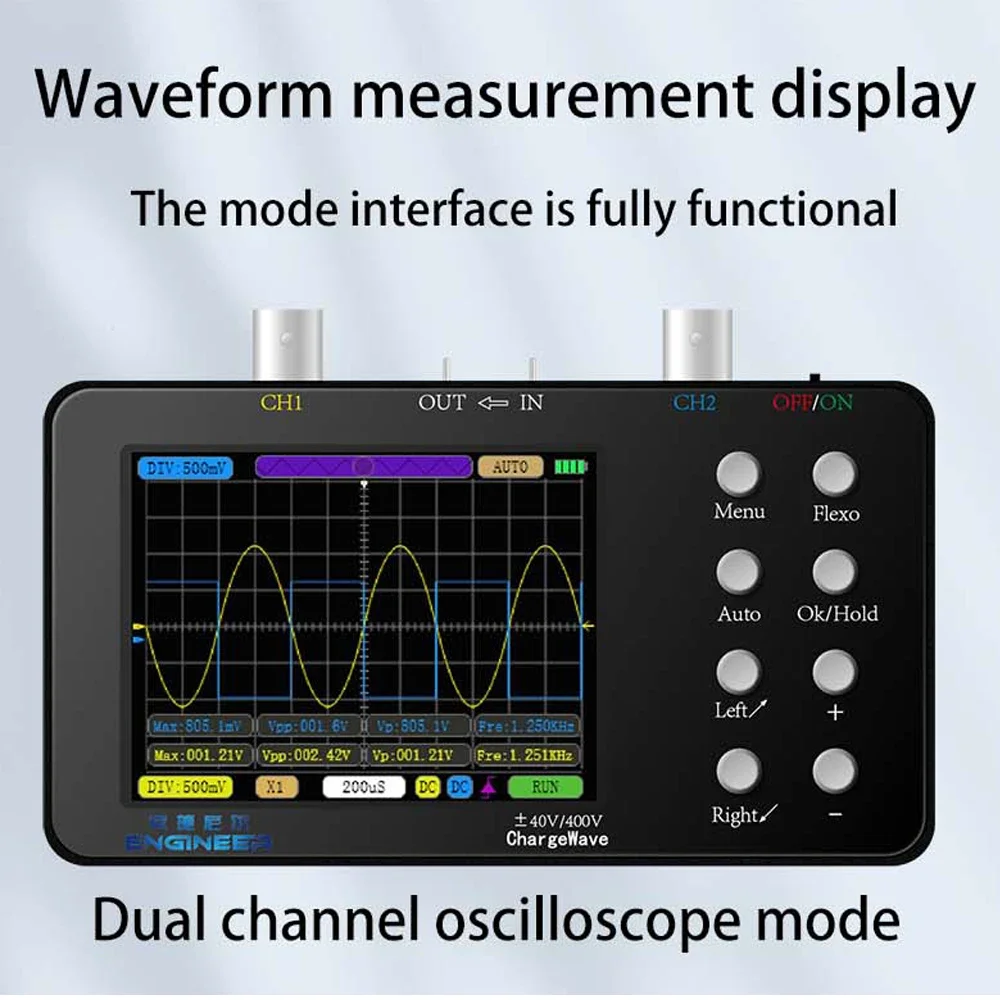 L’oscilloscope numérique est un appareil à deux canaux doté d’un taux d’échantillonnage de 50M et d’une bande passante analogique de 10M. Il offre des fonctions de déclenchement complètes, ce qui permet d’utiliser aussi bien des signaux analogiques périodiques que des signaux numériques non périodiques