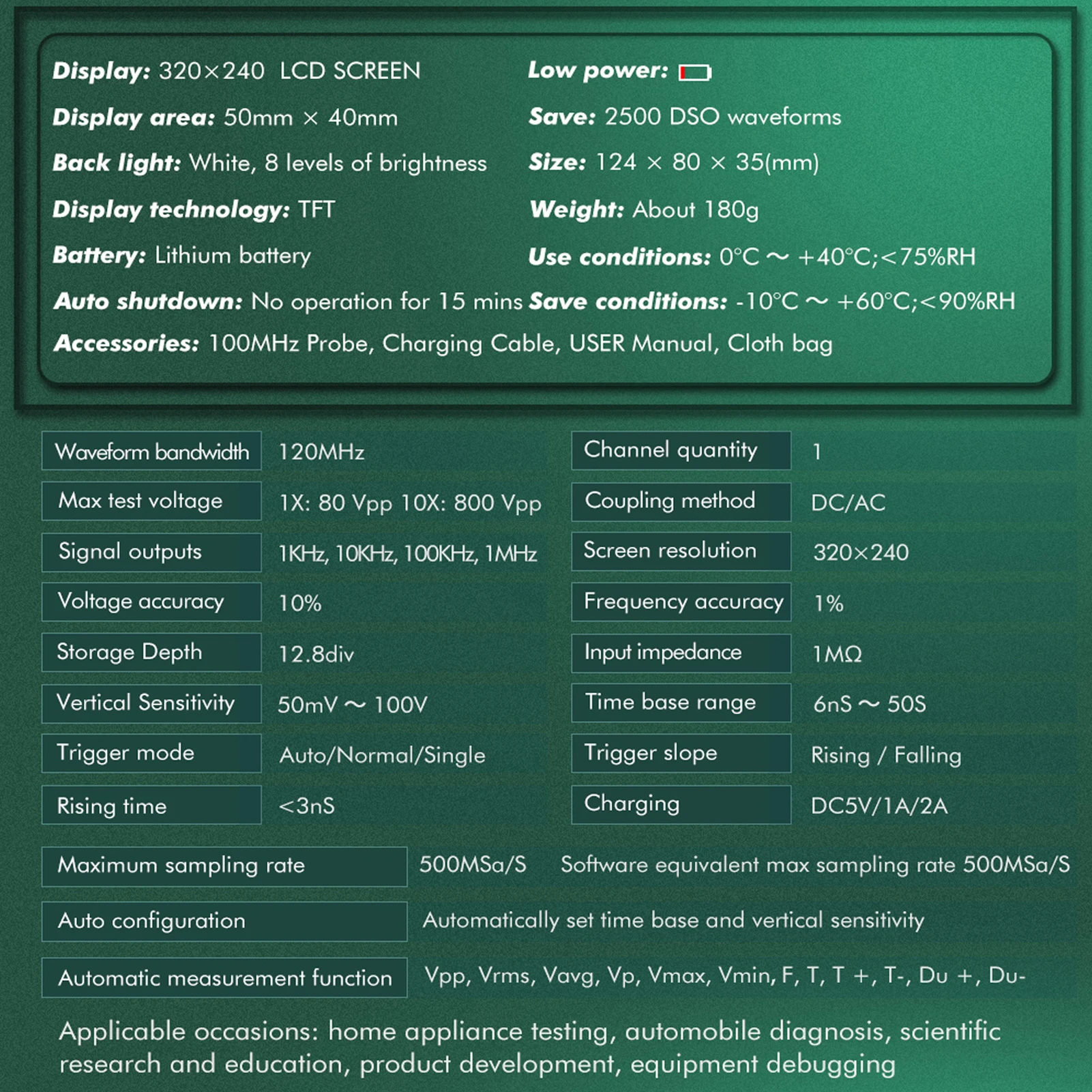 - Bande passante analogique de 120MHz et taux d’échantillonnage de 500 MS/s