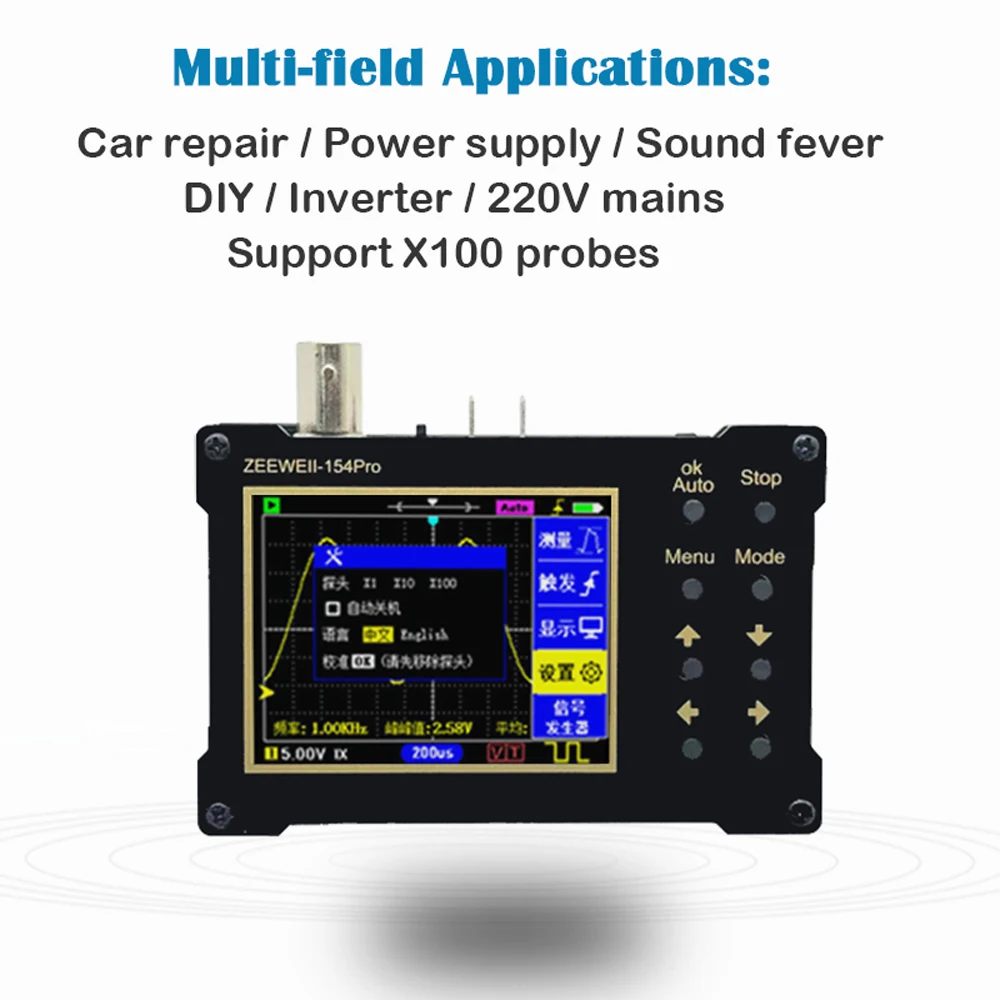 Cet oscilloscope de qualité a l’architecture ARM + FPGA + ADC, taux d’échantillonnage 40MSa/s, plus stable et avec des précisions plus élevées. Largement appliqué sur le débogage mcu, la réparation de voiture, la réparation d’appareils ménagers, la compétition électronique de bricolage, le débogage de l’alimentation, l’onduleur, etc. Vous pouvez essayer.