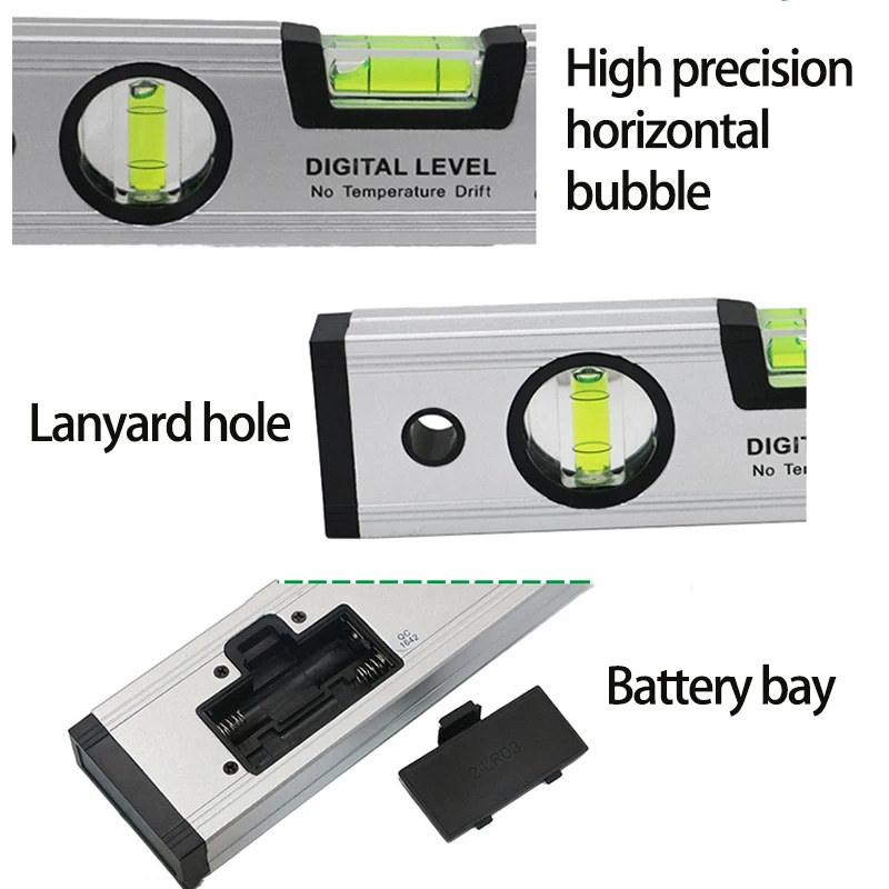 Ce niveau à bulle électrique magnétique numérique est un rapporteur inclinomètre qui peut mesurer tous les angles dans une plage de 360° ou quatre quadrants de 90°. Il peut afficher à la fois les degrés et les inclinaisons. Cet instrument permet de mesurer les surfaces horizontales et verticales, ainsi que les angles de toutes les pentes montantes et descendantes.