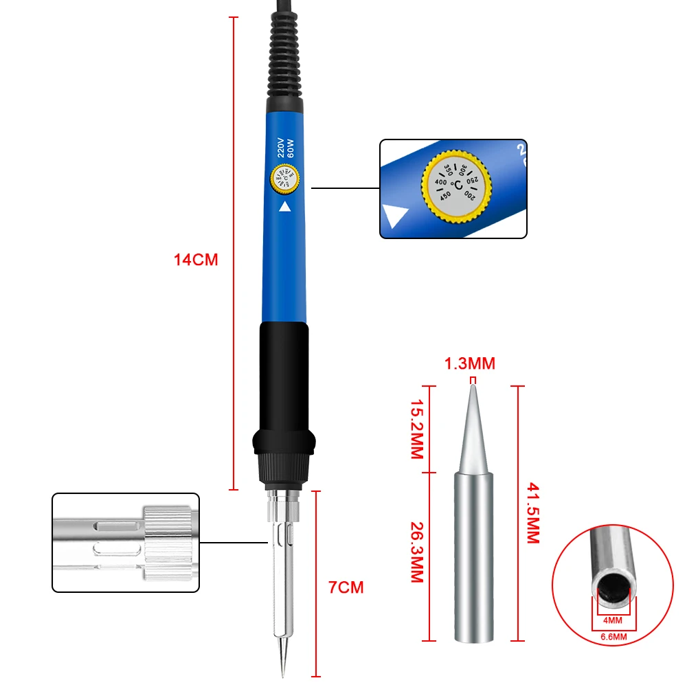 L’ensemble de fer à souder à température réglable est un outil utile pour les travaux de soudage. Il est équipé d’une station compacte et d’une mini poignée pour une utilisation professionnelle. La température peut être ajustée de 200°C à 450°C à l’aide d’une molette de réglage. Les pointes plaquées en fer interchangeables sont idéales pour une utilisation électronique et électrique. Ce fer à souder est alimenté par une tension de 110V ou 220V selon le modèle choisi.