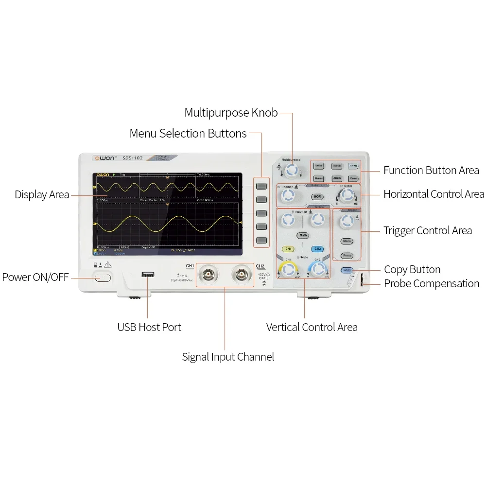 L’OWON SDS1102 Oscilloscope est un oscilloscope numérique à 2 canaux avec une bande passante de 100MHz et un taux de 1GS/s. Il est équipé d’un écran LCD de 7 pouces offrant une haute résolution. Cet oscilloscope est idéal pour le débogage de circuit électronique, l’essai de circuit, la conception et la fabrication, l’éducation et la formation ainsi que l’entretien et l’essai d’automobile.