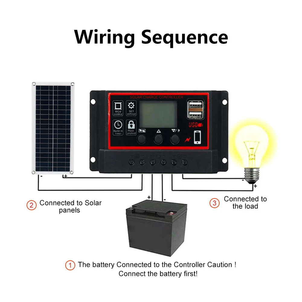- Le contrôleur ne peut fonctionner correctement qu’après avoir été connecté à la batterie.