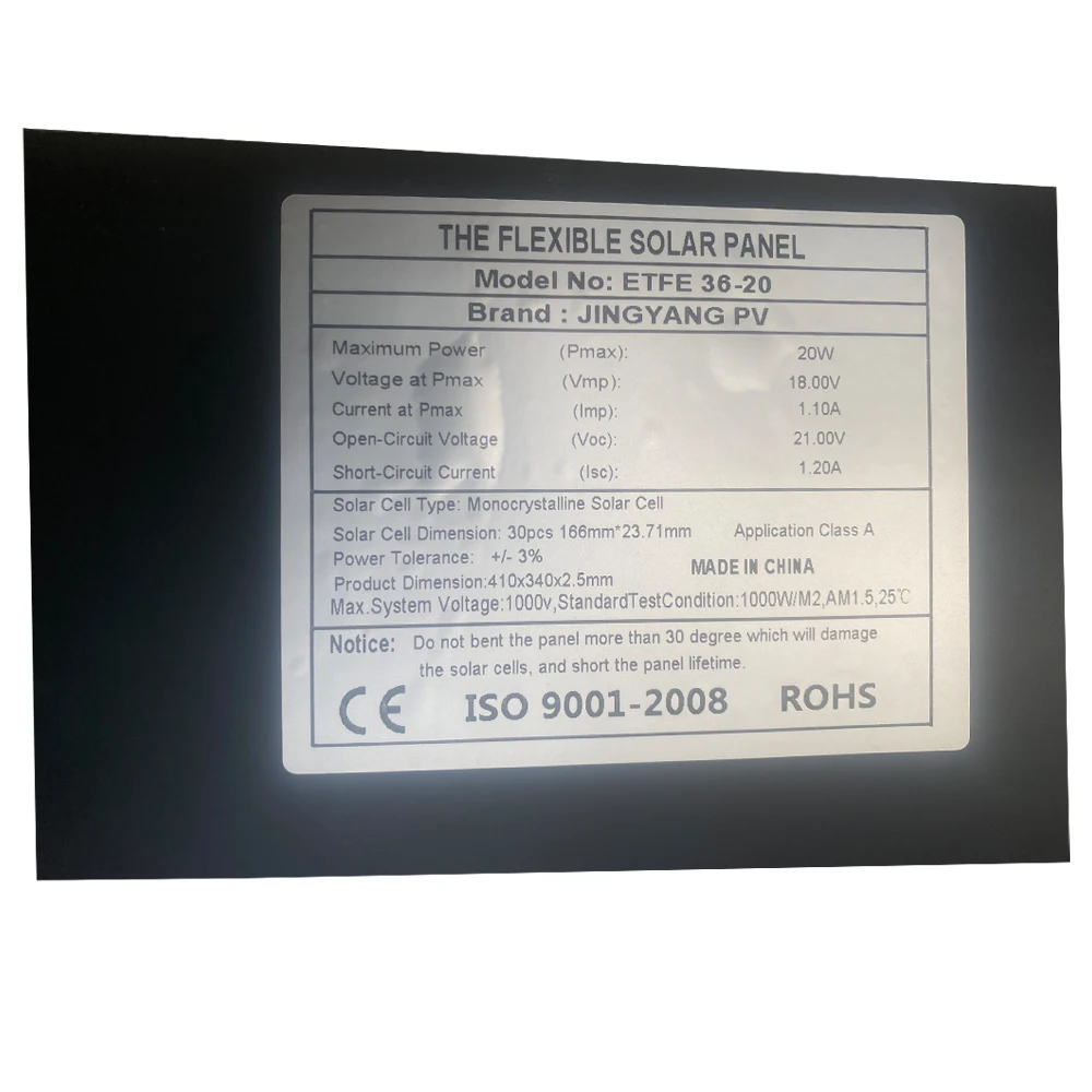 Le panneau solaire ETFE 20W est un panneau solaire flexible conçu pour la recharge de batterie 12V. Il mesure 410MM * 340MM et offre une puissance maximale de 20W. Sa tension de puissance maximale est de 18V et son courant de puissance maximale est de 1.1A. La tension de circuit ouvert est de 21V et le courant de circuit ouvert est de 1.2A. Ce panneau solaire peut fonctionner à une tension maximale du système de 600V.