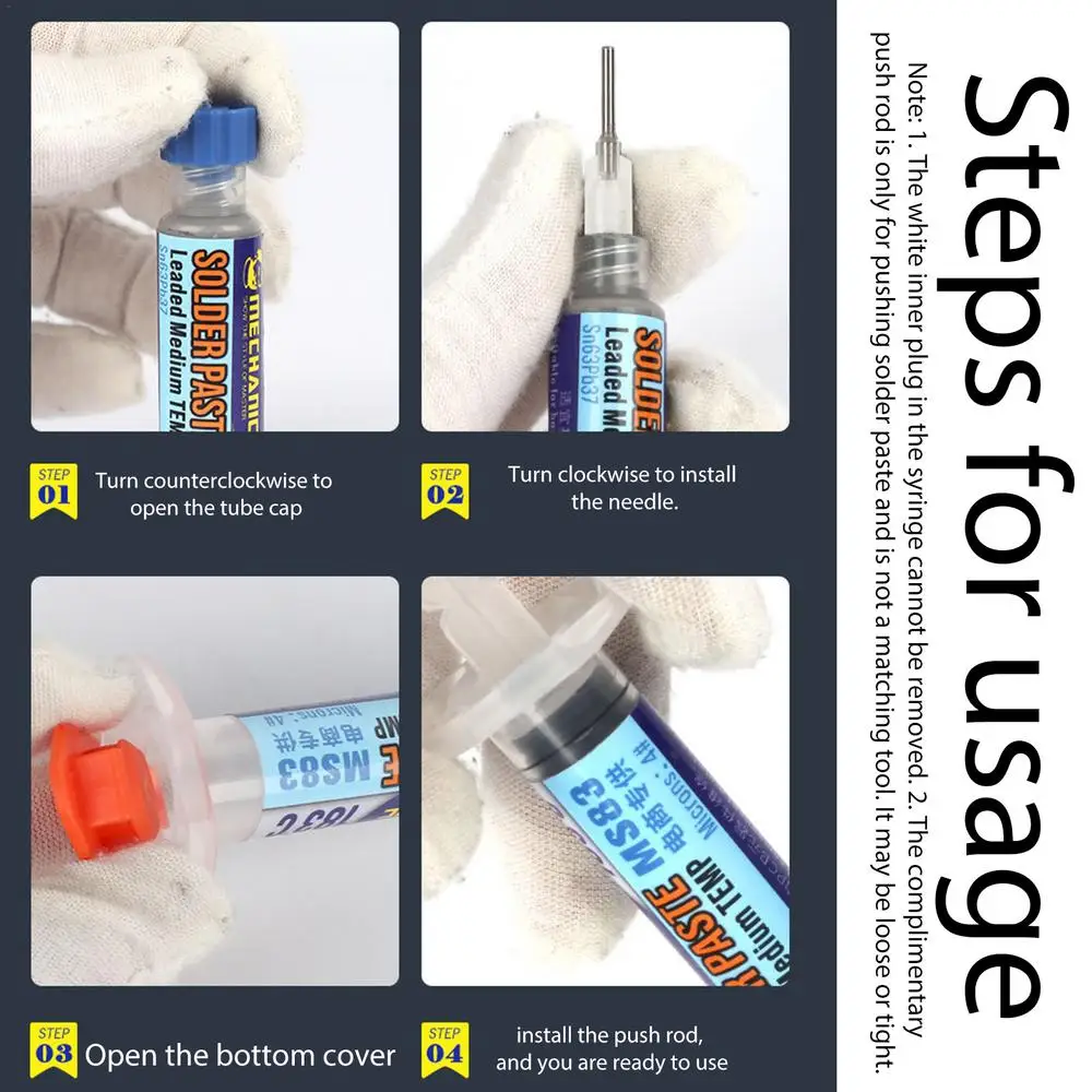 - Seringue pâte à souder x 1 ensemble (1 pâte à souder + 1 tige de poussée + 3 aiguilles)