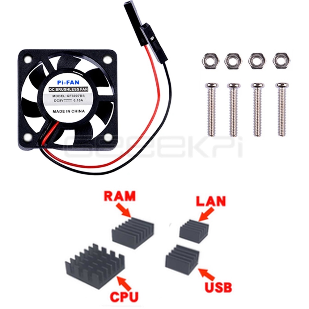 Ventilateur et Dissipateurs pour évacuer la chaleur dégagée par la carte Raspberry Pi et ainsi contribuer à son refroidissement.