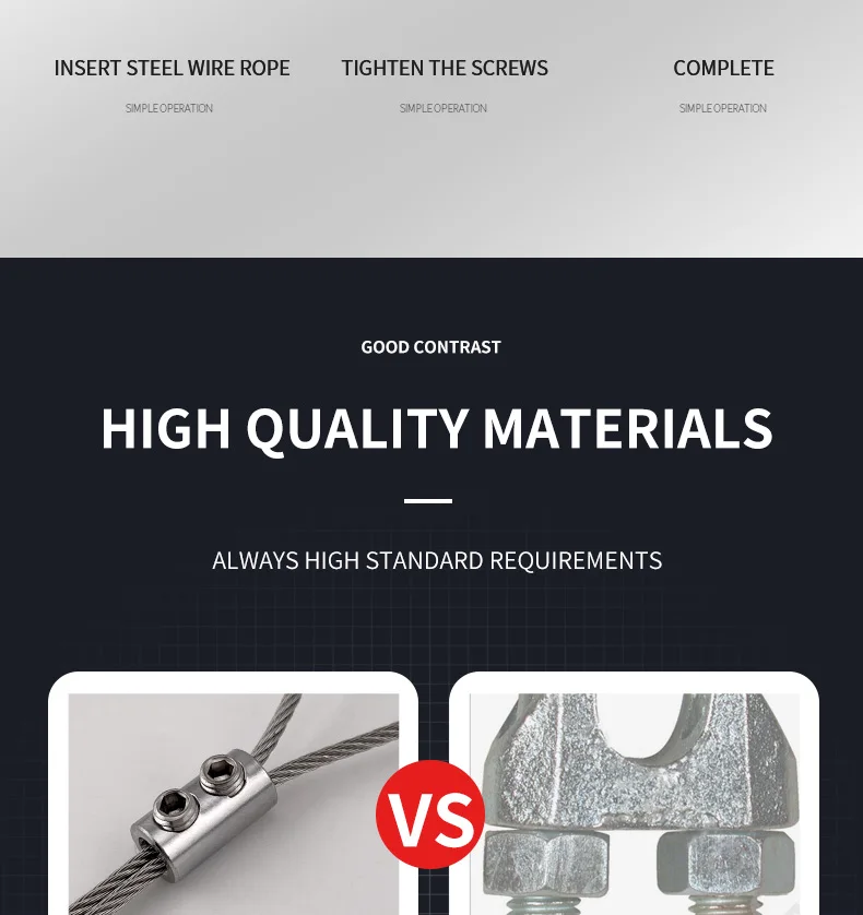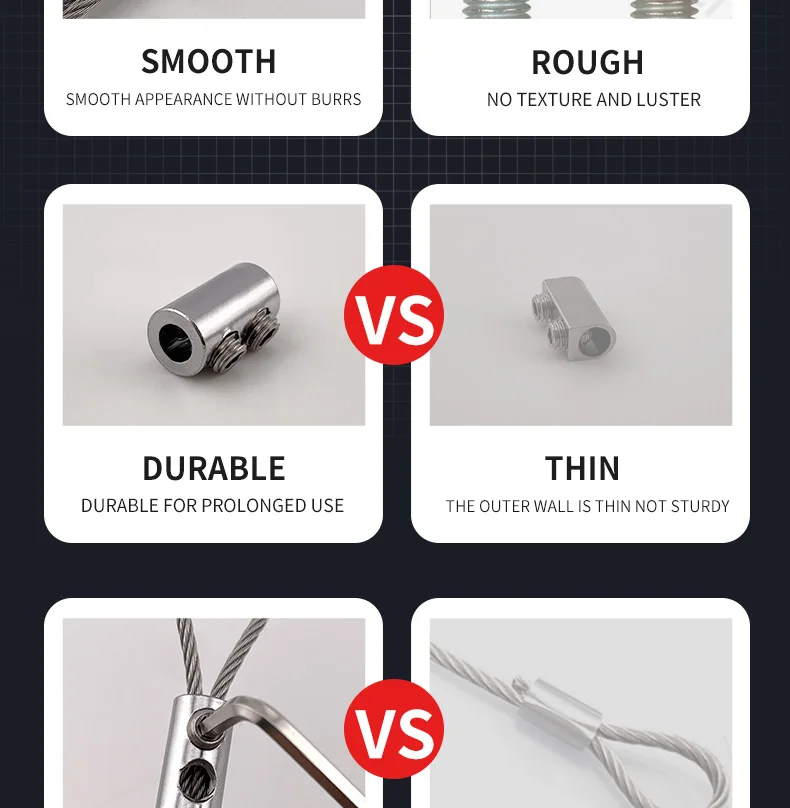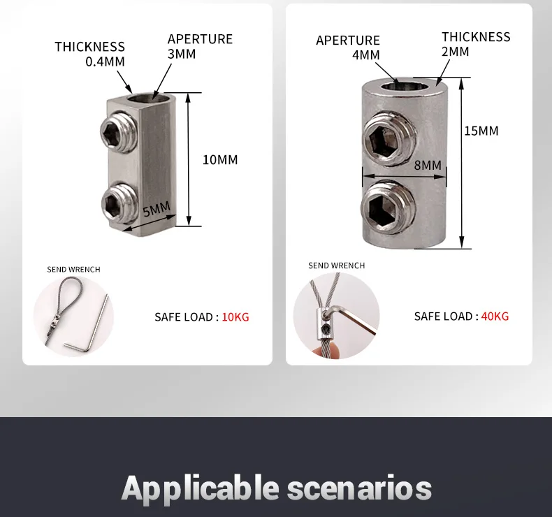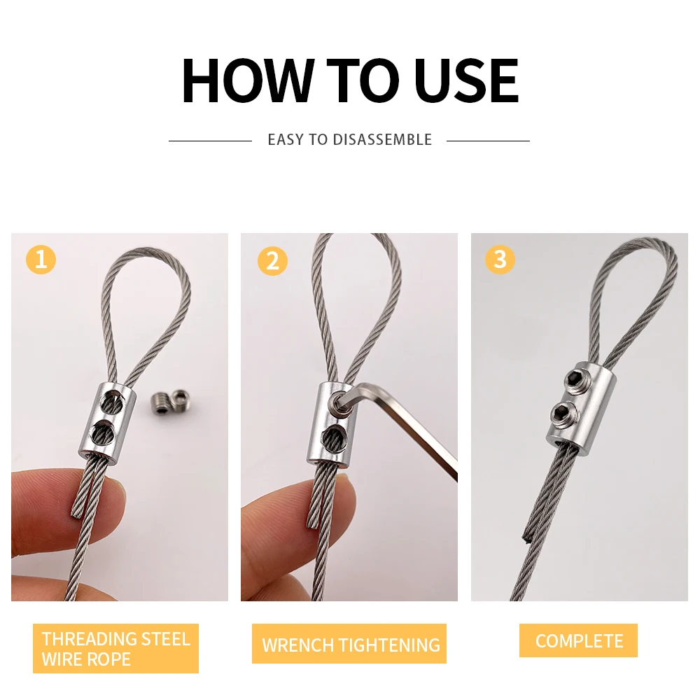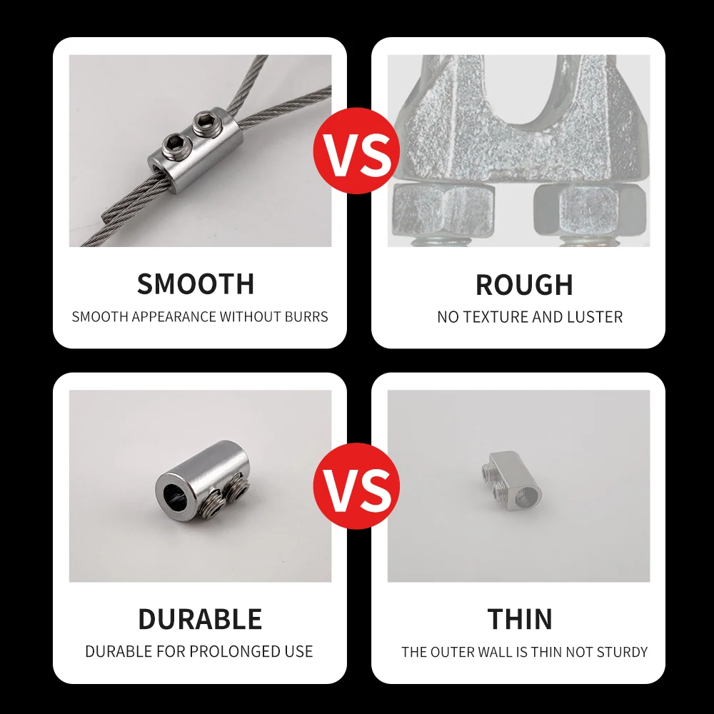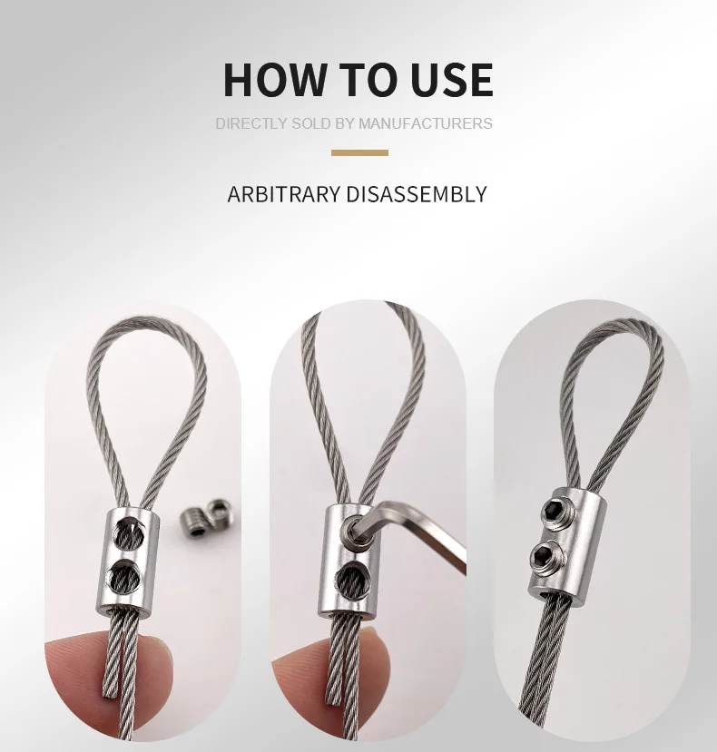 Les pinces de suspension pour câble métallique 1.5/2mm sont principalement utilisées pour fixer les câbles en acier. En ajustant les vis, la longueur du câble en acier peut être ajustée de manière flexible, ce qui le rend robuste et durable.