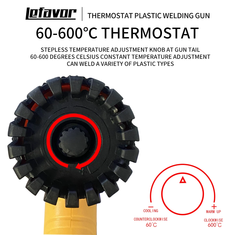 Vous pouvez régler la température du pistolet en utilisant le bouton de réglage de chaleur situé sur l’appareil. Commencez par régler la puissance de chauffage à la vitesse la plus basse, puis augmentez progressivement jusqu’à atteindre la température idéale pour le soudage.