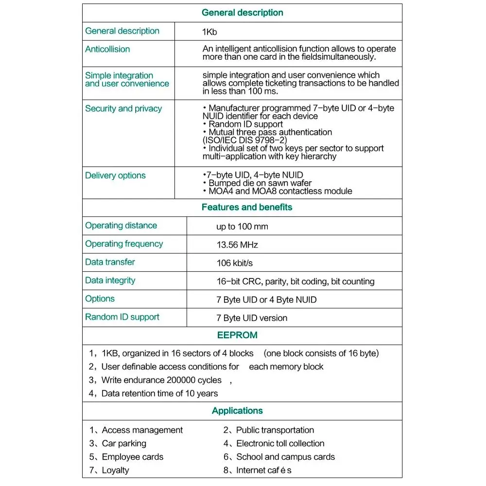 | Application | Contrôle d’accès, serrures d’hôtel, présence du personnel, contrôle d’accès et de paiement du campus scolaire, systèmes d’identification et de sécurité, entrée et paiement du parking, gestion de la sécurité sociale, paiement du transport, paiement des services municipaux et accessoires |