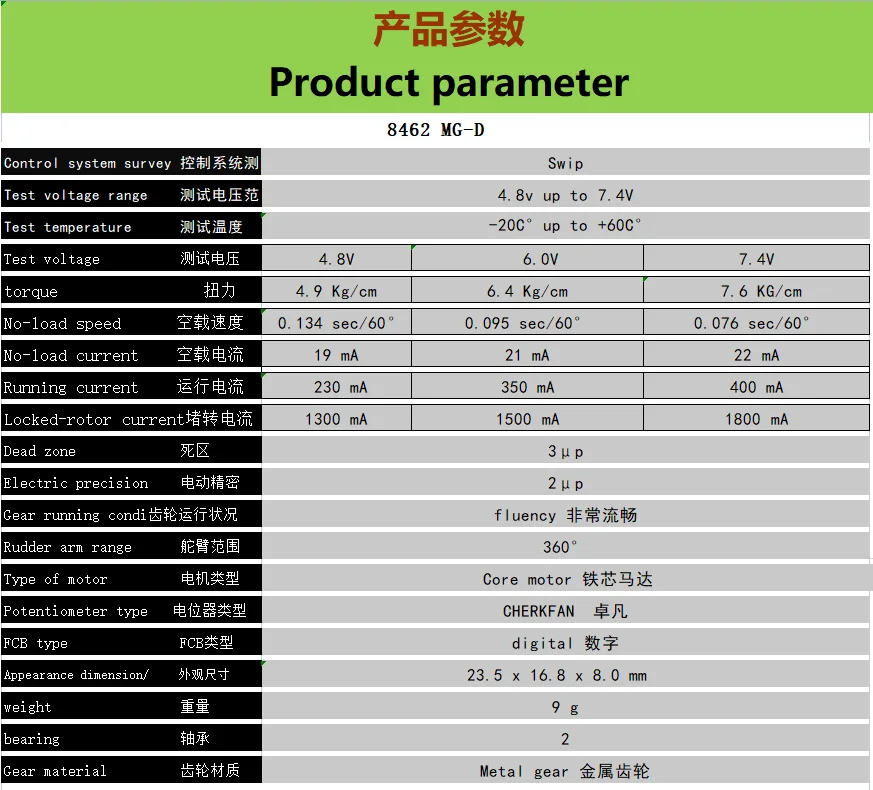 • Vitesse/couple @ 7.4V : 0.076 sec / 60° 7.6 Kg/cm