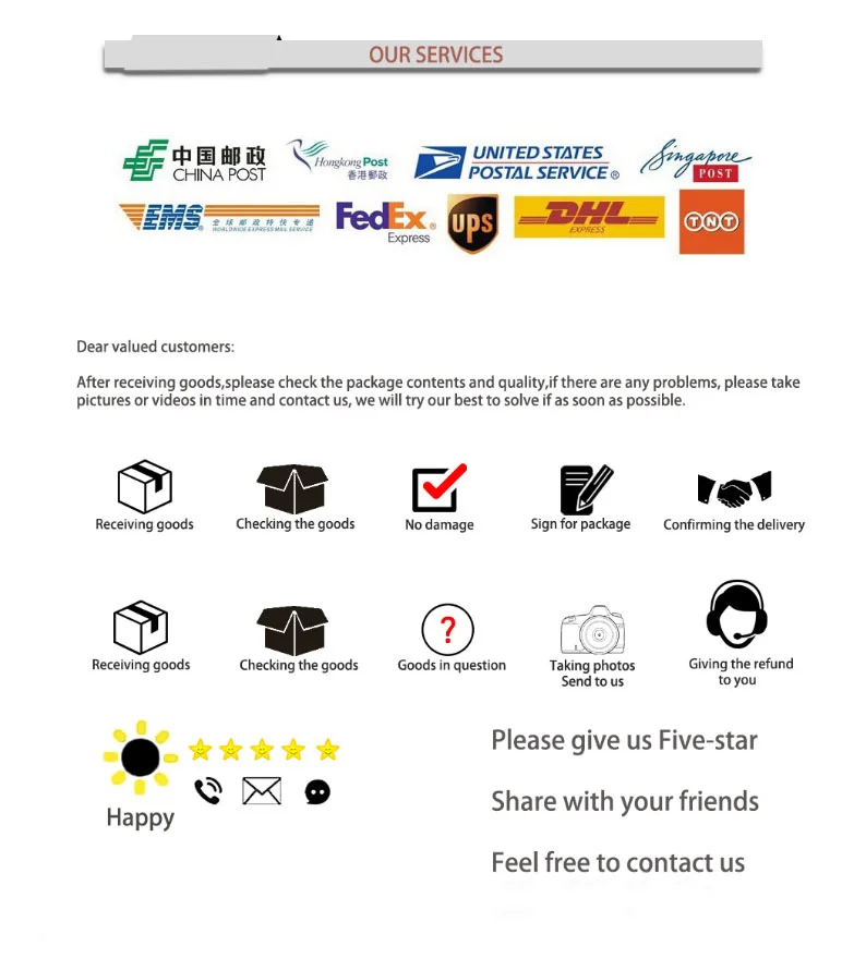 3. Commentaires: Les commentaires sont très importants pour nous. Si vous êtes satisfait de notre service, veuillez laisser un commentaire de 5 étoiles. S’il y a un problème avec nos articles, nous les résoudrons dès que possible. Merci d’avance.