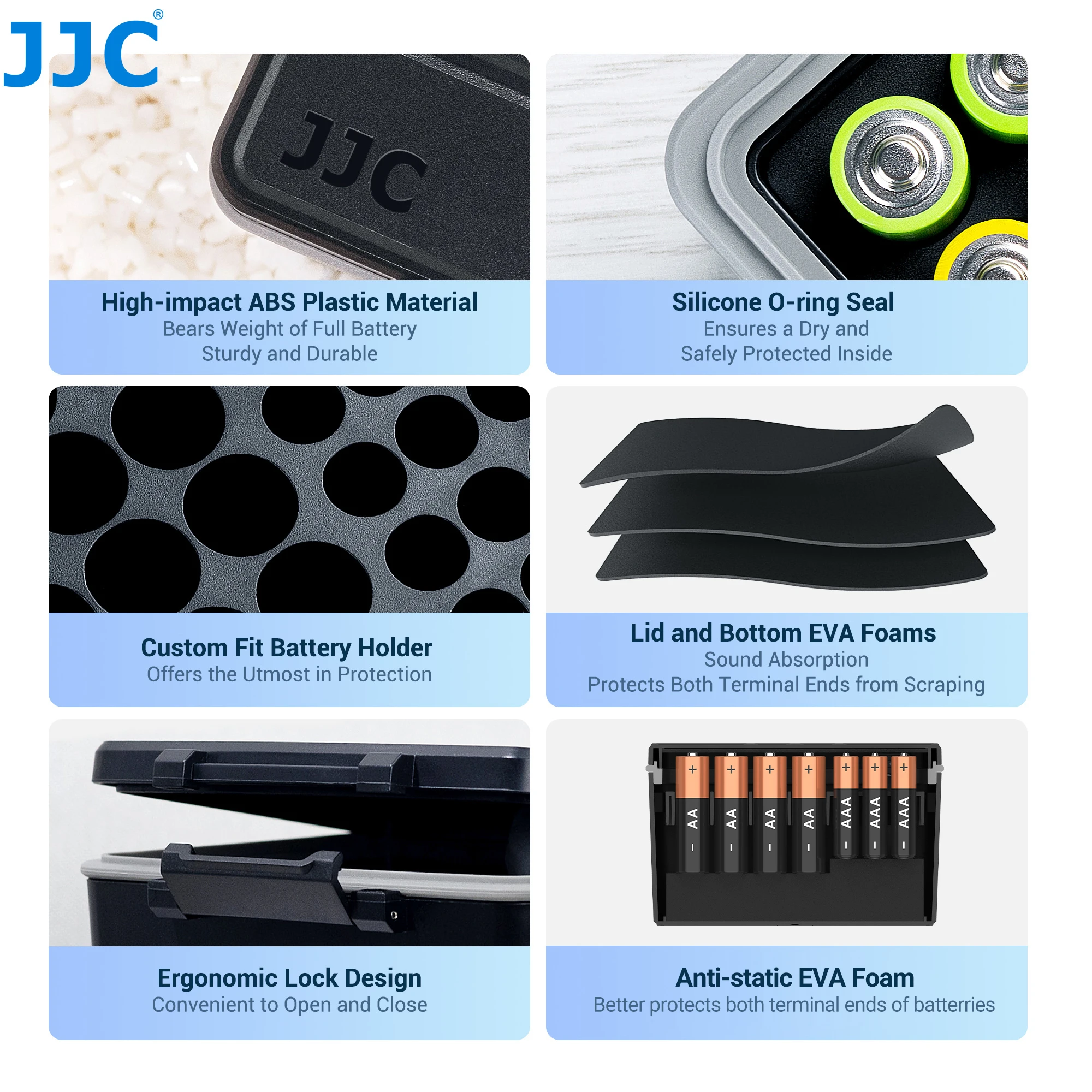 - Les mousses EVA du couvercle intérieur et du fond sont destinées à l’absorption acoustique, ce qui protège mieux les deux extrémités terminales de chaque batterie insérée contre les éraflures.