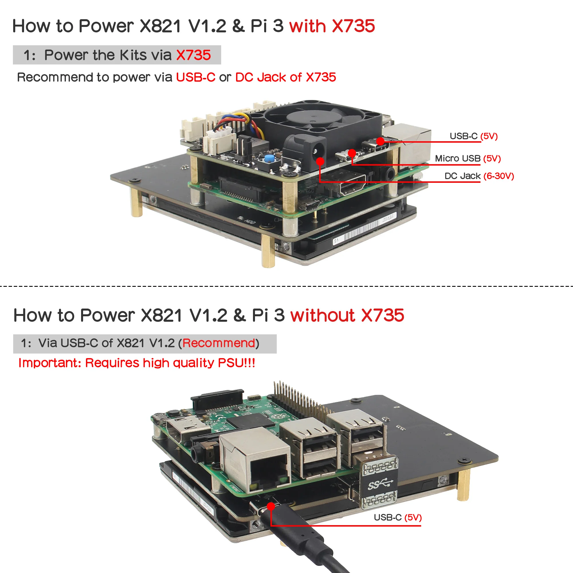 - Ou alimentation via X735 si vous avez le X735: DC 6-30V In / USB-C 5V In