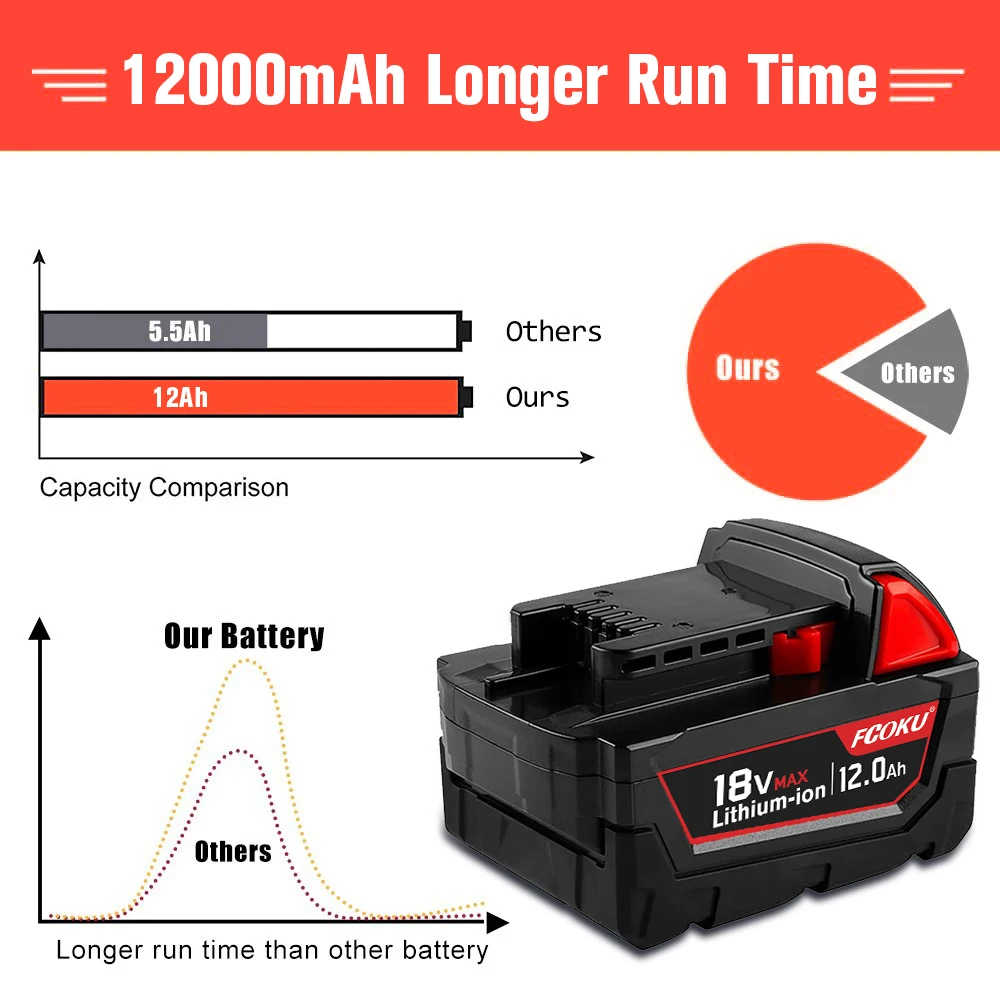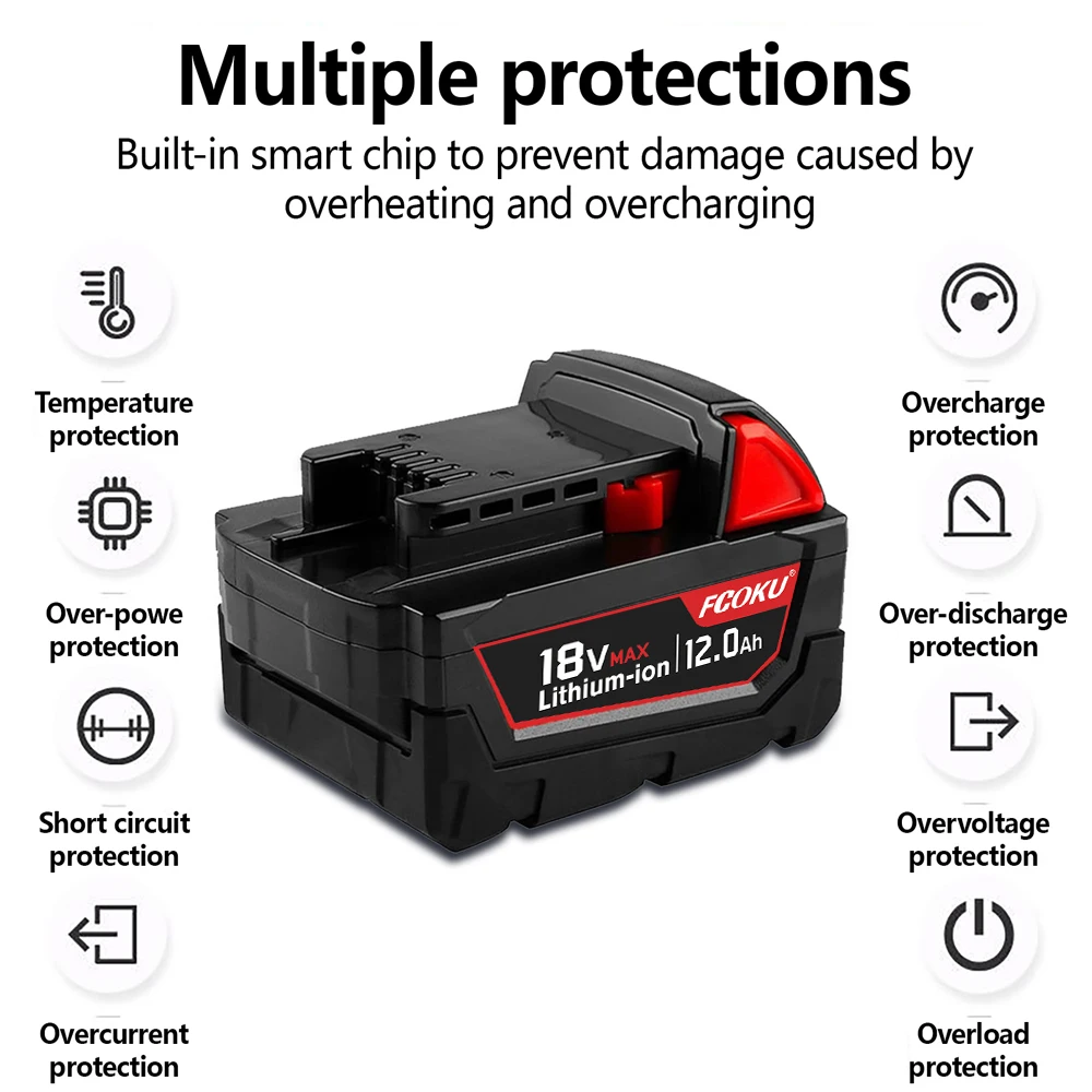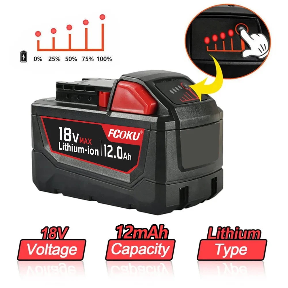 La batterie lithium-ion de rechange pour Milwaukee M18 est une batterie originale de 18V avec une capacité de 12,0 Ah. Elle est compatible avec les outils électriques 48-11-1860 et 48-11-1850. Ce modèle inclut un chargeur.