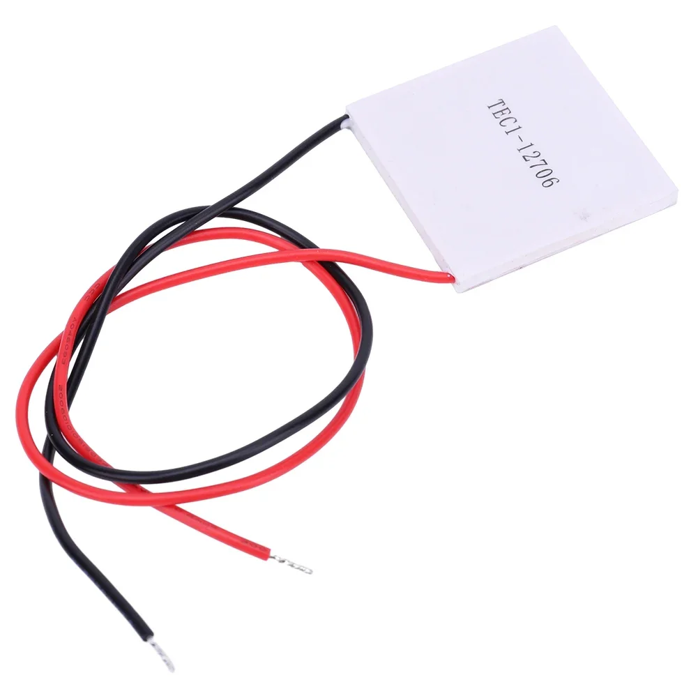 Pour utiliser le TEC1-12706, vous aurez besoin d’une plaque de refroidissement, d’un dissipateur de chaleur, de graisse thermique, d’un coussin isolant et d’une alimentation. Appliquez de la graisse thermique sur les surfaces de refroidissement et de chauffage de la plaque de refroidissement, installez la plaque sur le dissipateur de chaleur en plaçant un coussin isolant entre les deux, serrez les vis, mettez sous tension et commencez à refroidir.