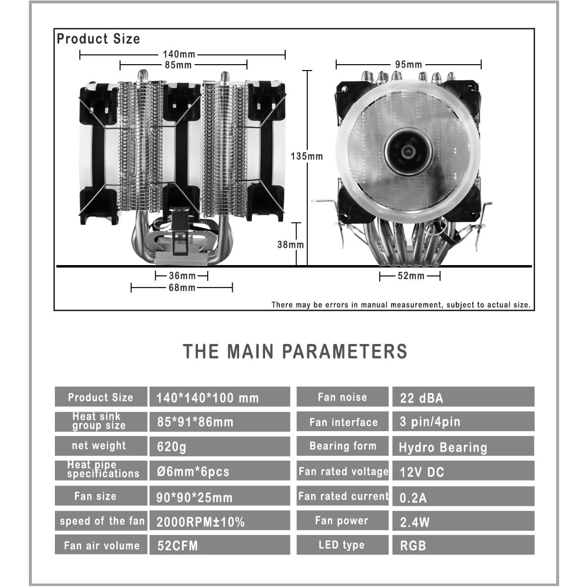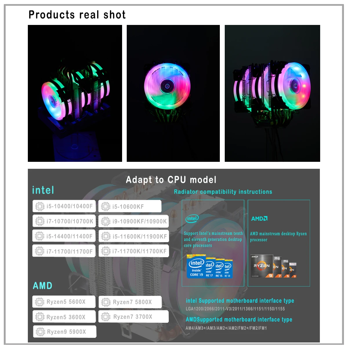 Il est compatible avec les interfaces de carte mère Intel LGA1200/2066/2011-V3/2011/1366/1151/1150/1155 et les interfaces de carte mère AMD AM4/AM3 +/AM3/AM2 +/AM2/FM2 +/FM2/FM1. Cela le rend adapté à une large gamme de configurations.