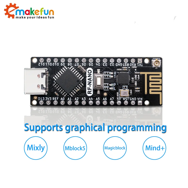 RF nano est une carte de développement sans fil 2.4G développée par emakefun basée sur la carte mère standard officielle Arduino Nano V3.0 intégrée avec Nrf24L01 + puces sans fil. Sa taille et ses broches sont entièrement compatibles avec la carte de développement nanoV3.0 standard, directement compatible avec la bibliothèque open source RF24, et peut être réglé pour la consommation d’énergie, le taux de transmission, le canal et d’autres paramètres.