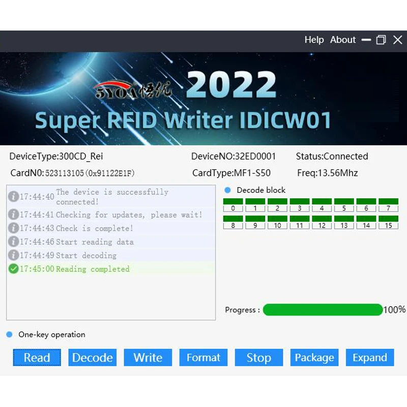 - Prise en charge de la fréquence d’écriture: 125KHz, 250KHz, 500KHz, 375KHz, 625khz, 750kHz, 875KHz, 1000KHZ, 13.56MHz (ISO1443A/B), HID Prox cartes