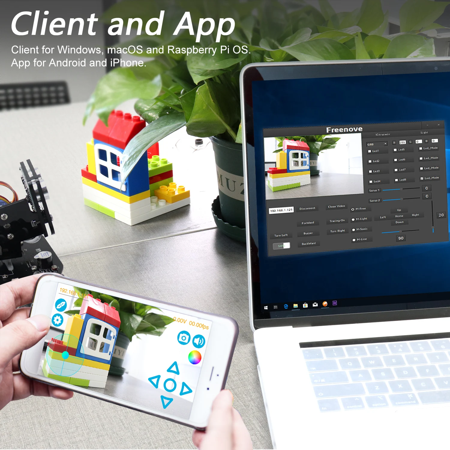 Ce kit de roue de voiture Mecanum est un choix idéal pour ceux qui souhaitent découvrir la joie des robots ou apprendre à programmer. Il est compatible avec les modèles Raspberry Pi 4B / 3B+ / 3B / 3A+ (recommandé) et d’autres modèles nécessitant des pièces supplémentaires. Le kit est livré avec un tutoriel détaillé et du code Python complet, que vous pouvez télécharger avant d’acheter. Vous pourrez contrôler la voiture à partir d’un ordinateur, d’un appareil Android ou d’un iPhone.