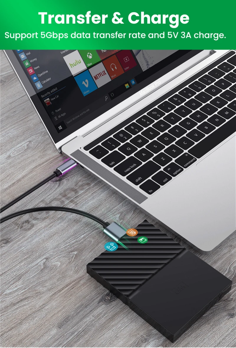 Le câble USB Type-C vers Micro B 3.0 offre une transmission de données en duplex intégral grâce à ses deux groupes de câbles. Un groupe est utilisé pour envoyer des données et l’autre groupe est utilisé pour recevoir des données, permettant des opérations de lecture et d’écriture à pleine vitesse simultanément. Cette fonctionnalité n’était pas prise en charge par les versions précédentes de l’USB.