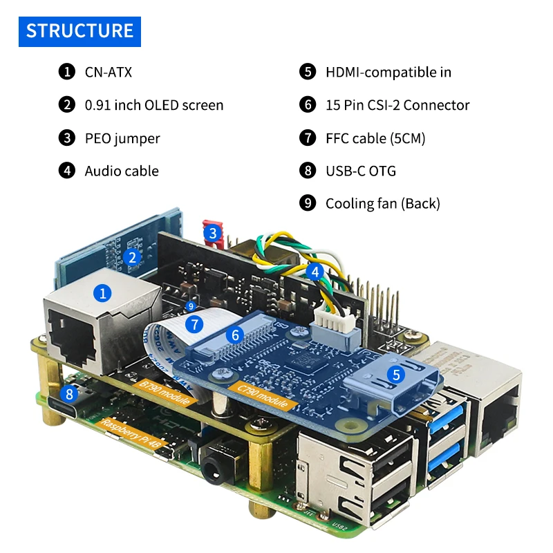 • Affichage OLED avec nom, adresse IP, température, charge CPU et temps de fonctionnement