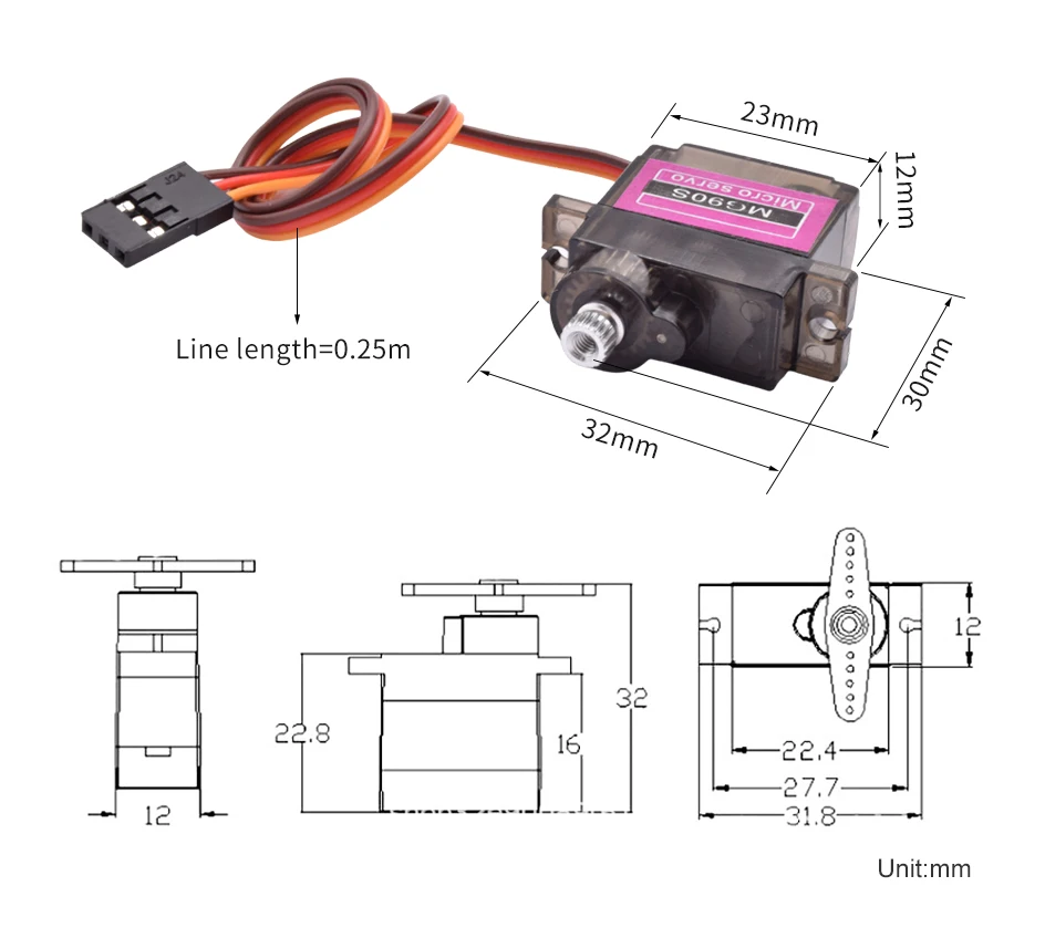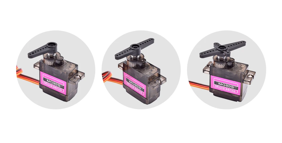 | MG90S | 22.8×22.4x12mm | 2 kg/cm | 0.11 secondes/60 degrés (4.8V) |