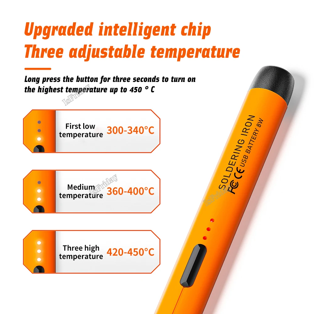 Ce fer à souder est compact et portable, vous permettant de l’emporter partout avec vous. Il dispose également d’une température réglable à 3 vitesses, avec une première vitesse de basse température allant de 330 à 360 ℃, une deuxième vitesse de température modérée allant de 370 à 400 ℃ et une troisième vitesse de haute température allant de 420 à 450 °C.