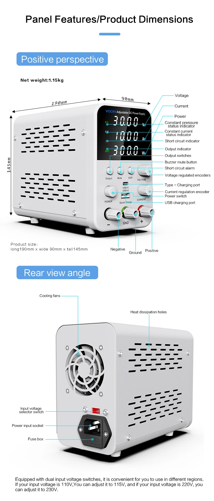 • Affichage LED de la tension, du courant et de la puissance, haute précision et caractéristiques de stabilisation de la tension, limitation du courant et fonctionnement simple.