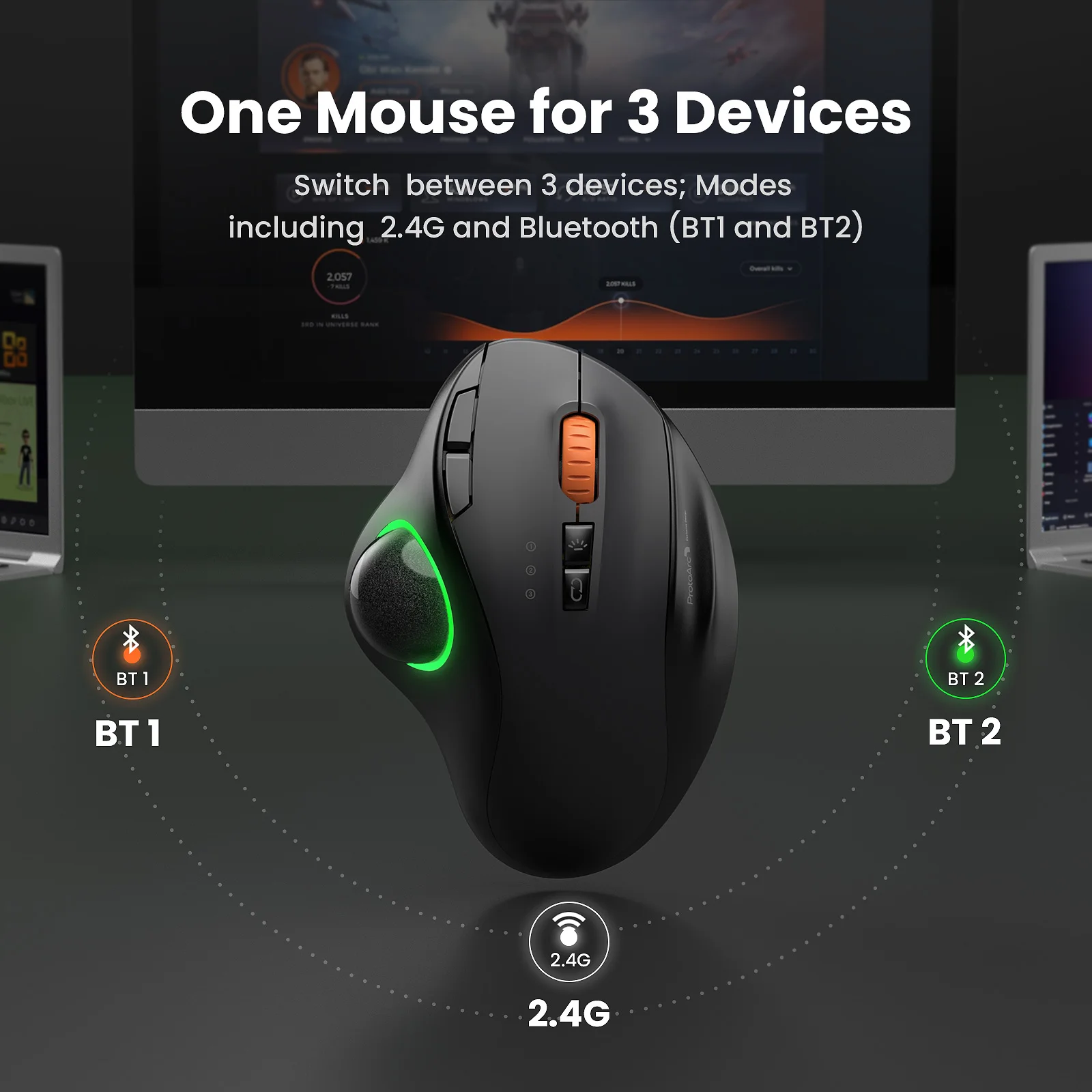 Basculer entre 3 appareils, modes dont 2.4g et bluetooth (BT 1 et BT2)
