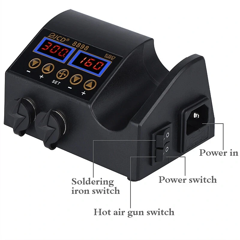 Cette station de soudage 2 en 1 de 750W est idéale pour la réparation de téléphones portables BGA SMD PCB IC. Elle comprend un réchauffeur d’air chaud avec une plage de température de 100 °C à 480 °C et une stabilité de température de ± 2 ℃. Le débit d’air maximal est de 150L/min. Le fer à souder a une puissance de sortie de 80W avec une plage de température de 180 °C à 500 °C et une stabilité de température de ± 1 °C. Il est également doté d’une conception ESD et d’un appareil de chauffage en céramique.