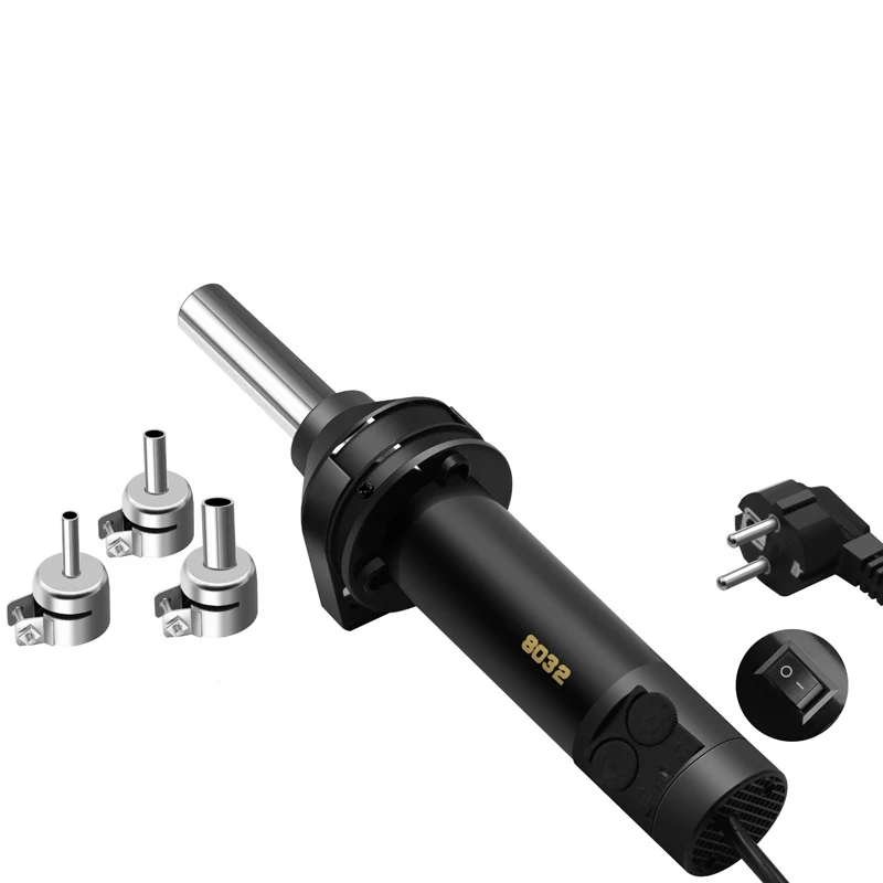 La station de soudage 8032 fonctionne avec une puissance d’entrée de 220V et une consommation électrique de 100-700W. Sa plage de température peut atteindre de 100 à 480 degrés Celsius. Elle dispose d’un noyau chauffant en métal et d’un moteur à turbine. Sa capacité d’air est de 30 L/min (max).