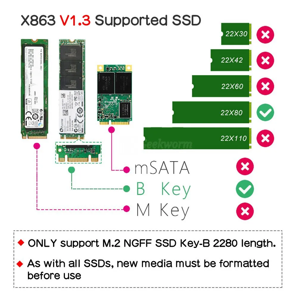 | Supporte uniquement les SSD M.2 NGFF SATA Key-B de longueur 2280 |
