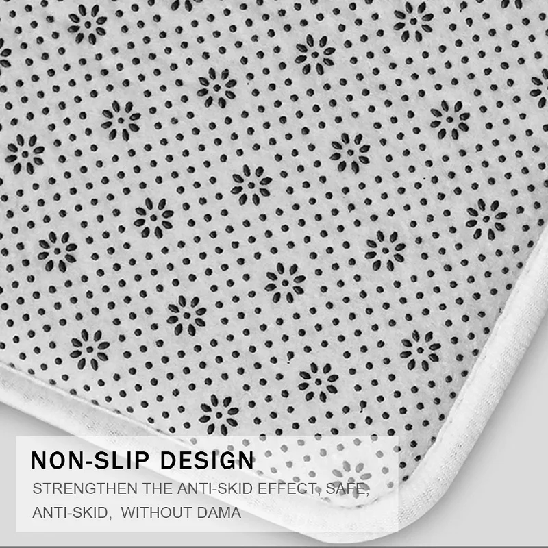 Les tapis sont fabriqués en flanelle 100% polyester, avec une mousse intercalaire pour plus de confort et un tissu non-tissé 100% polyester avec des points PVC au dos pour éviter le glissement. Ils sont faciles à nettoyer et peuvent être lavés directement à la machine ou à la main. Ils ne perdent pas leur couleur et ne se décolorent pas, et leur dos est conçu pour éviter l’exposition directe au soleil.