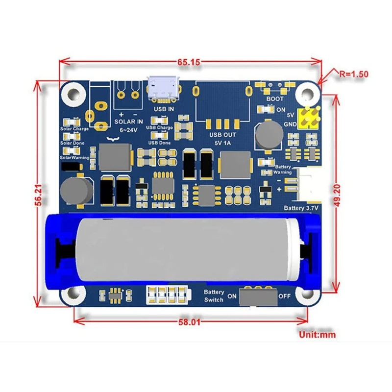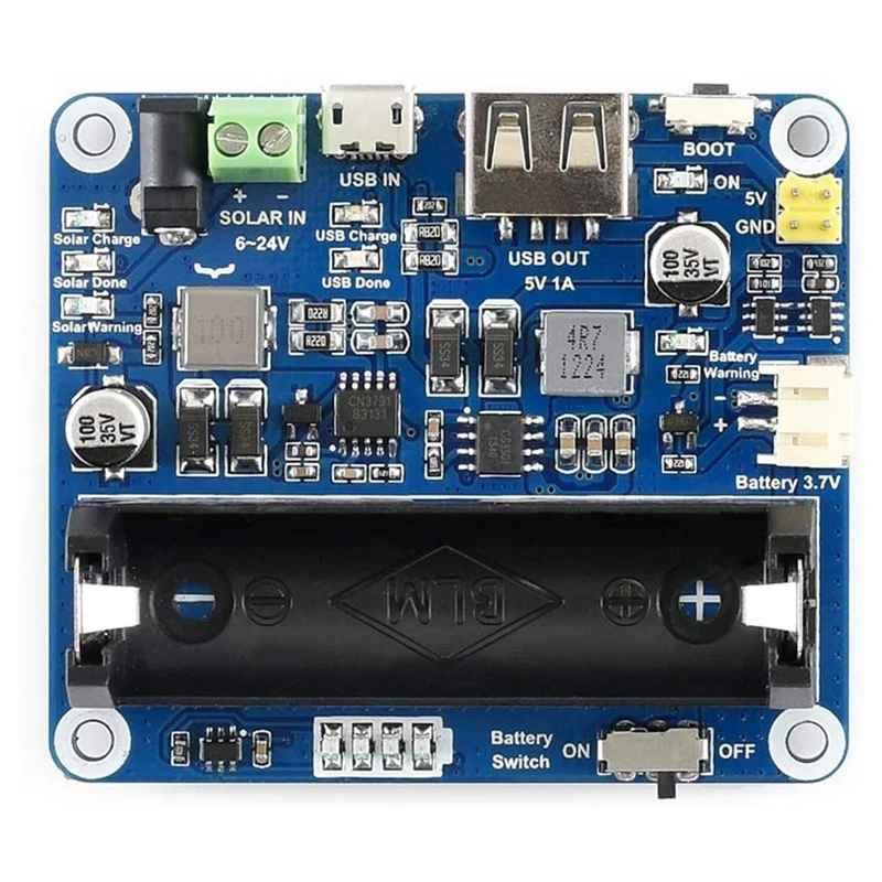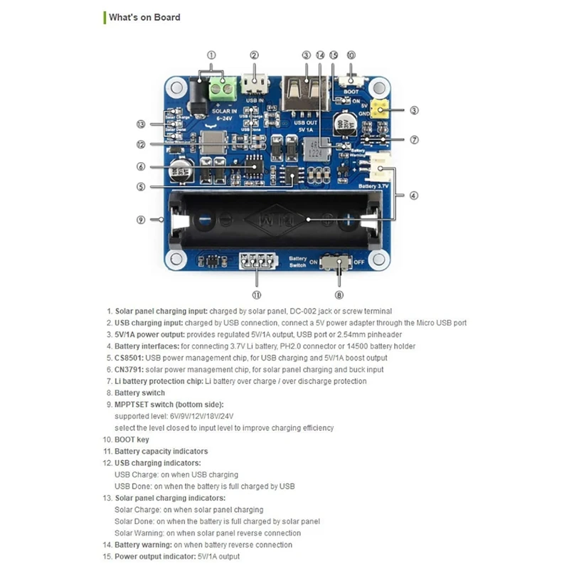 Le module est compatible avec la batterie 14500 et utilise un connecteur de batterie PH2.0 pour connecter plusieurs types de batteries Li 3.7V. Il est équipé de plusieurs indicateurs LED pour surveiller l’état du panneau solaire et de la batterie.