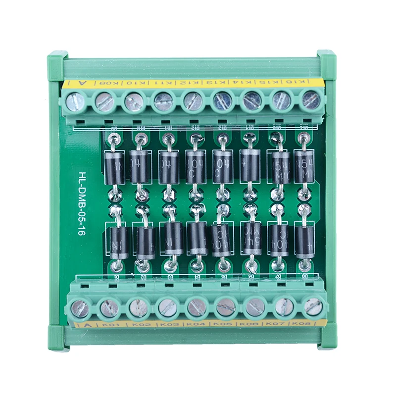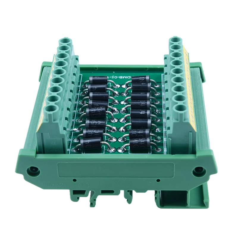Module de diode individuel à montage sur rail DIN 3 A 1000V 16. Diodes 1N5408. Pas 7.62mm bornier à vis. PCB fibre de verre FR-4, double couches de cuivre. Dimensions extérieures: 87*81*42mm (L x l x H). Boîtier/support de circuit imprimé de haute qualité, montable sur rail DIN-pour rails de largeur 35 / 32 / 15mm. Le boîtier de montage DIN peut être démonté pour une utilisation à montage sur panneau. 100% neuf, jamais utilisé. Courant évalué: 3 ampères. Tension de blocage maximale: 1000V DC. Température de fonctionnement: -20 °C à 50 °C.