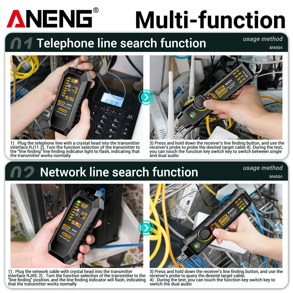 R: Le ANENG M469A est un testeur de câble réseau intelligent qui peut rechercher des lignes téléphoniques et des lignes réseau, vérifier les câbles d’alimentation, effectuer des tests de court-circuit et de tension CC, etc.