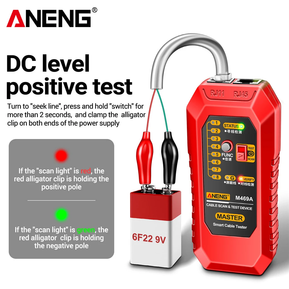 Le ANENG M469A est un testeur de câble réseau intelligent doté de plusieurs fonctionnalités. Il peut être utilisé pour rechercher des lignes téléphoniques, des lignes réseau, vérifier les câbles d’alimentation, effectuer des tests de court-circuit et de tension CC, etc. Il dispose également d’une fonction d’avertissement de basse tension, d’un réglage de volume ajustable, d’une fonction d’écouteur, d’un projecteur intégré et d’une économie d’énergie.