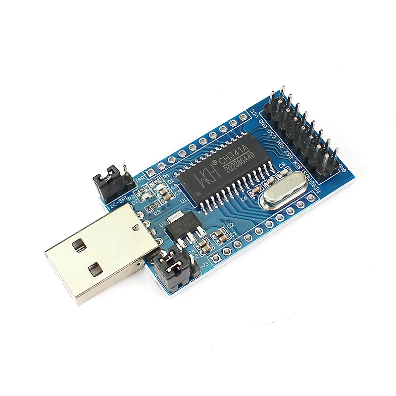 Le module CH341A prend en charge le port parallèle USB vers l’imprimante ainsi que le port parallèle en mode EPP ou MEM. Il est également compatible avec les interfaces UART, I2C et SPI. Ce module offre une sélection de tension de sortie entre 3.3V et 5V, et dispose d’un indicateur d’état de fonctionnement intégré pour faciliter son utilisation.
